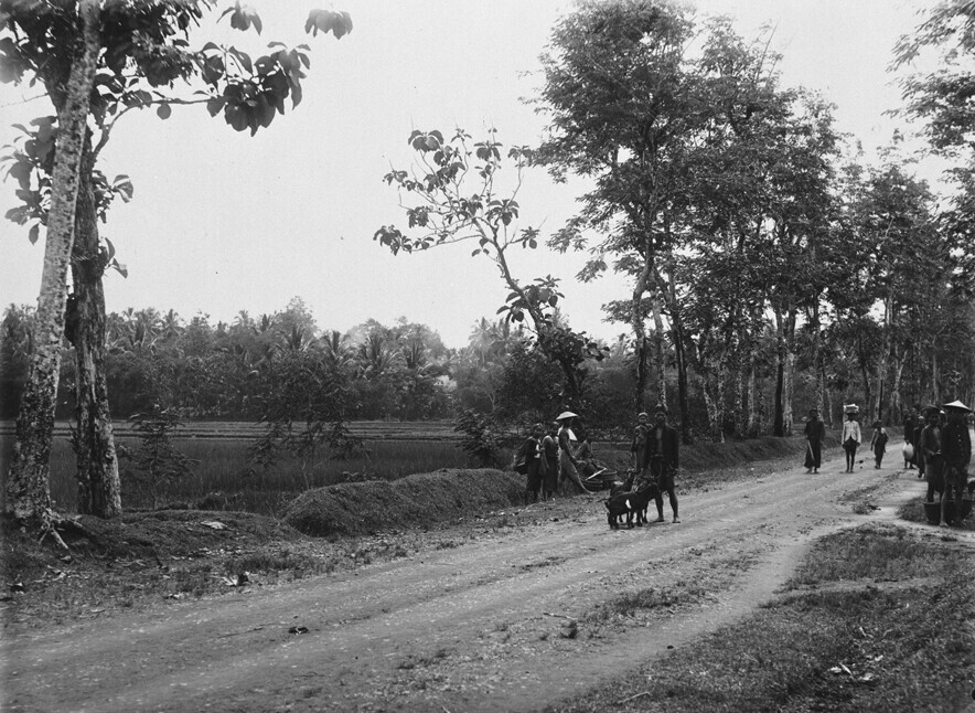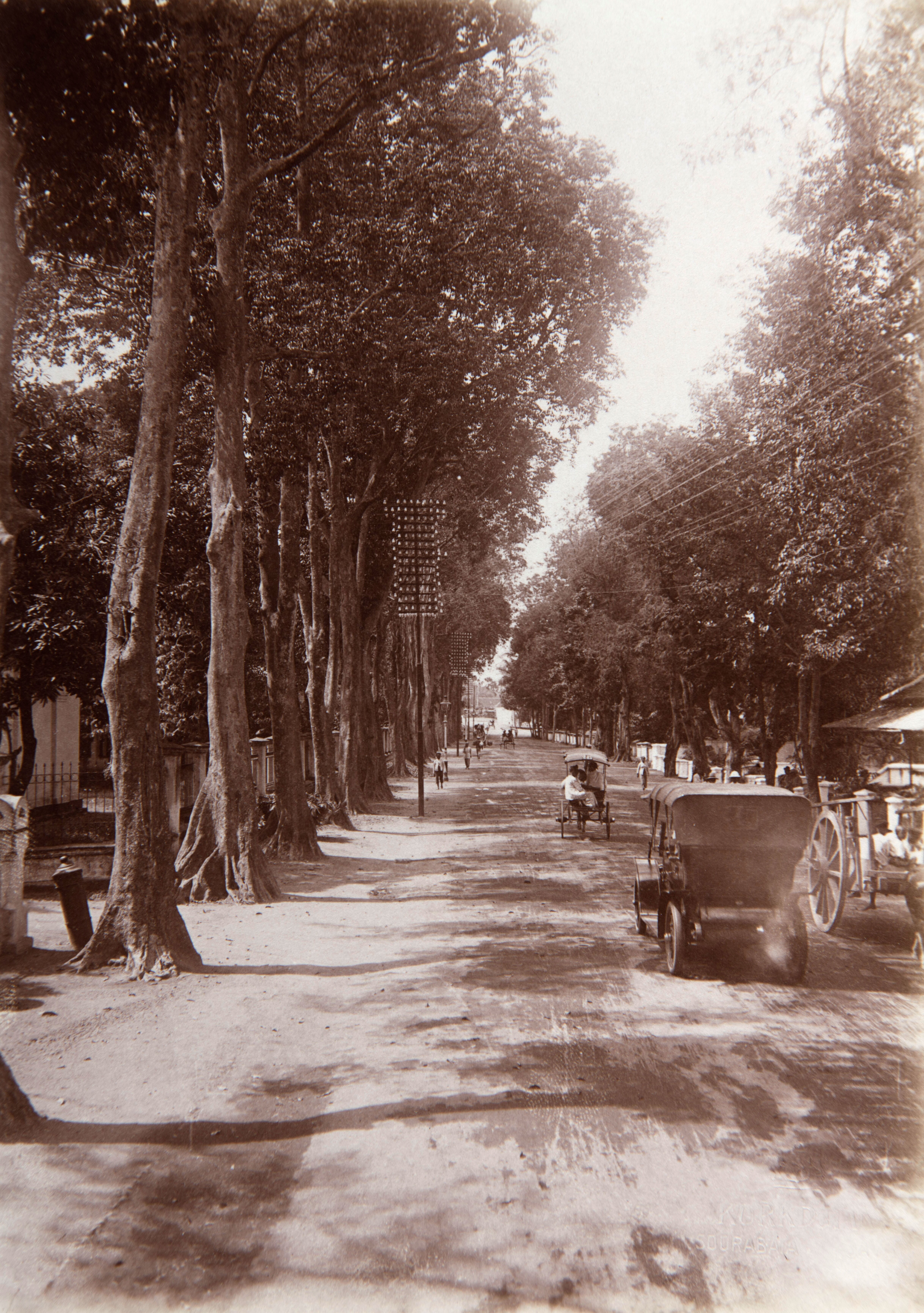 Laan met bomen waarin koetsen en karren rijden, cent...