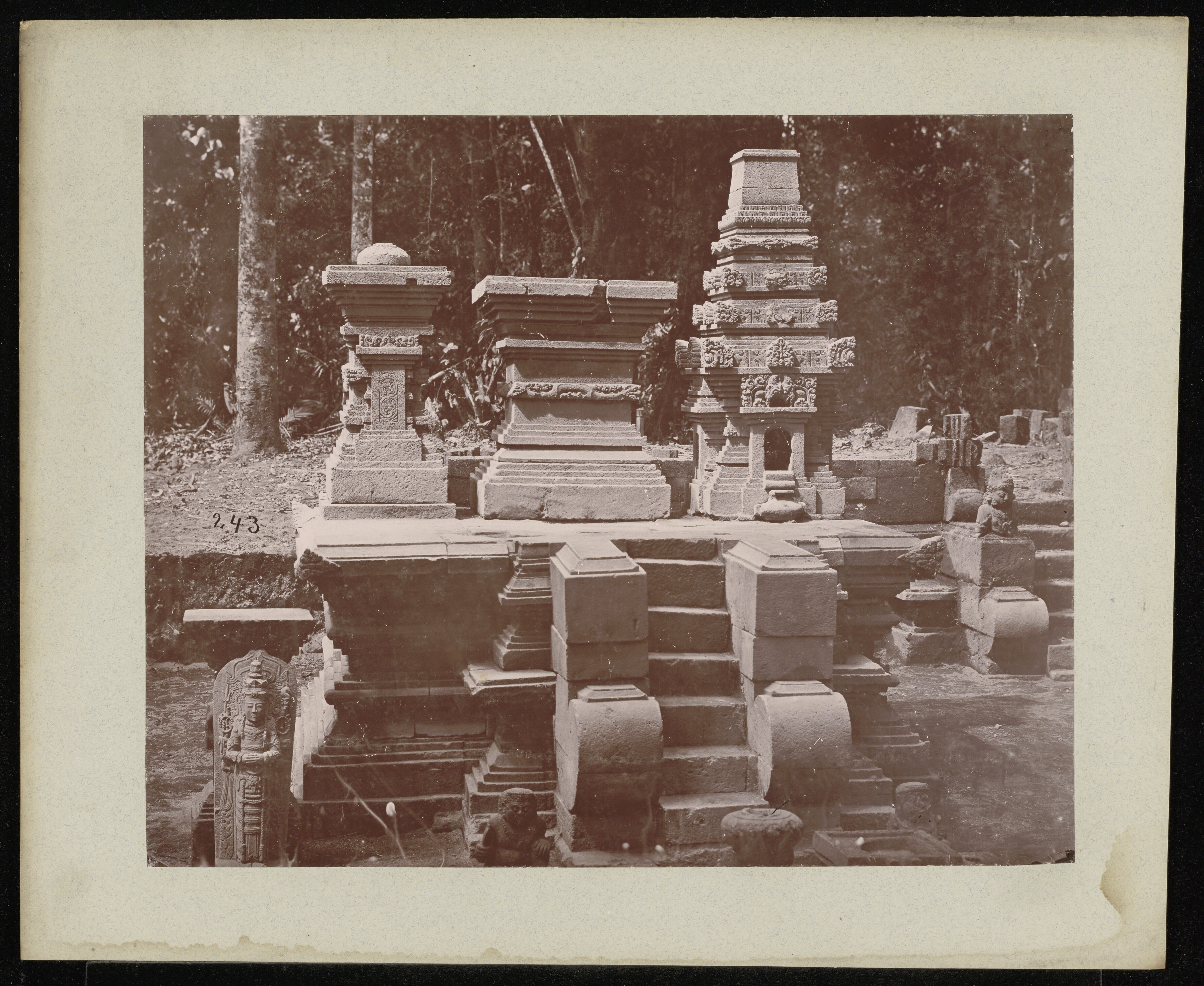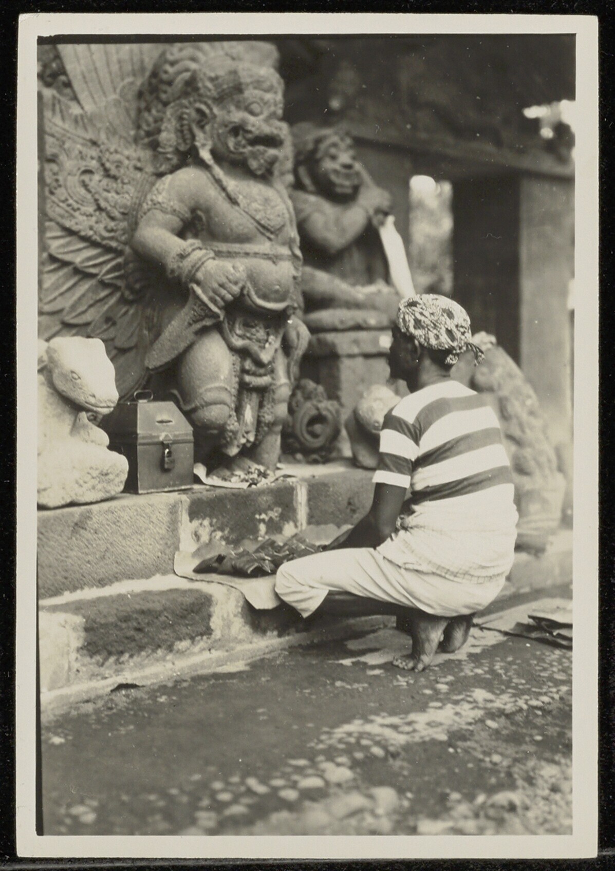Man brengt een offer bij een Indo-Javaans beeld in h...