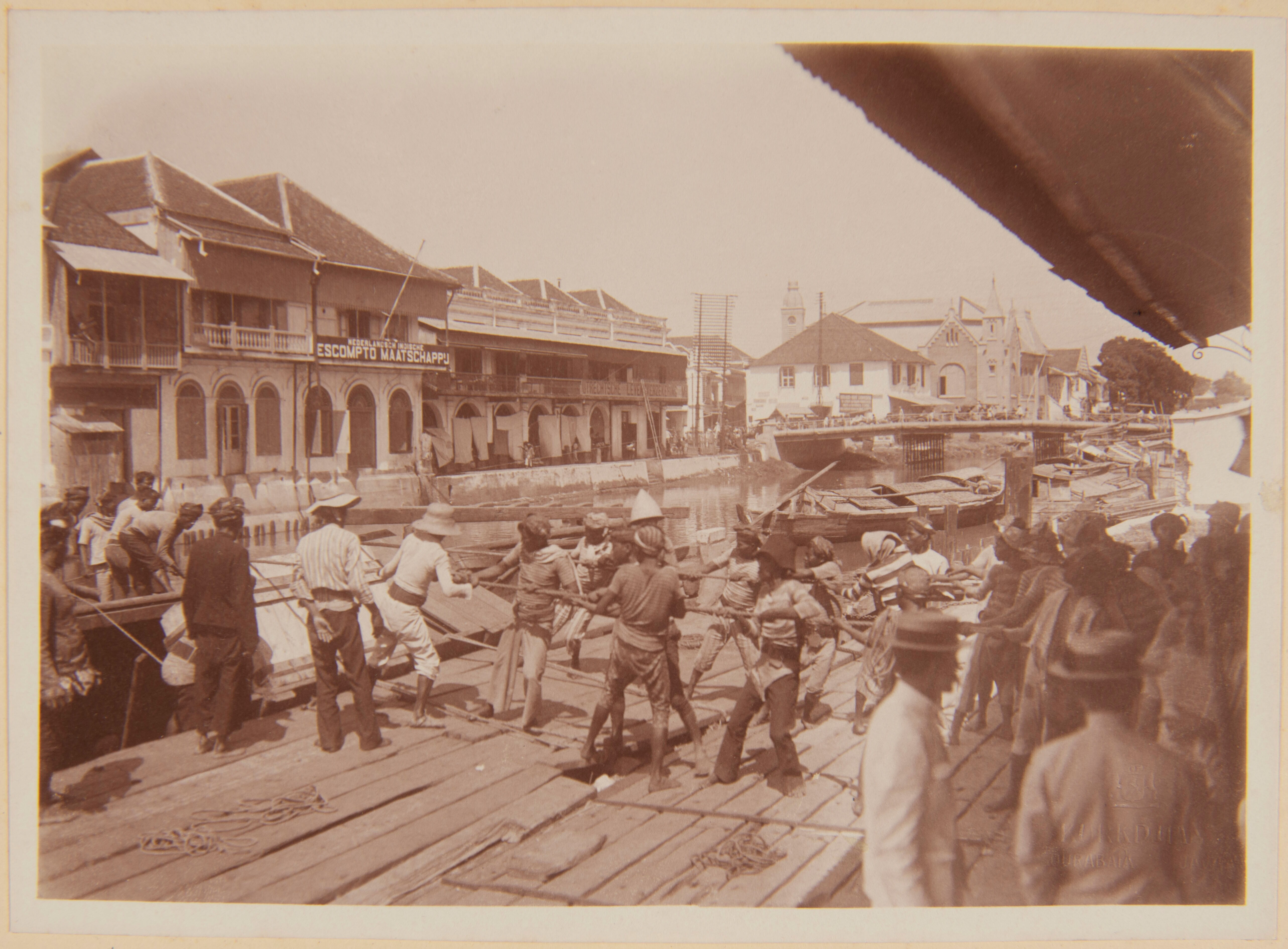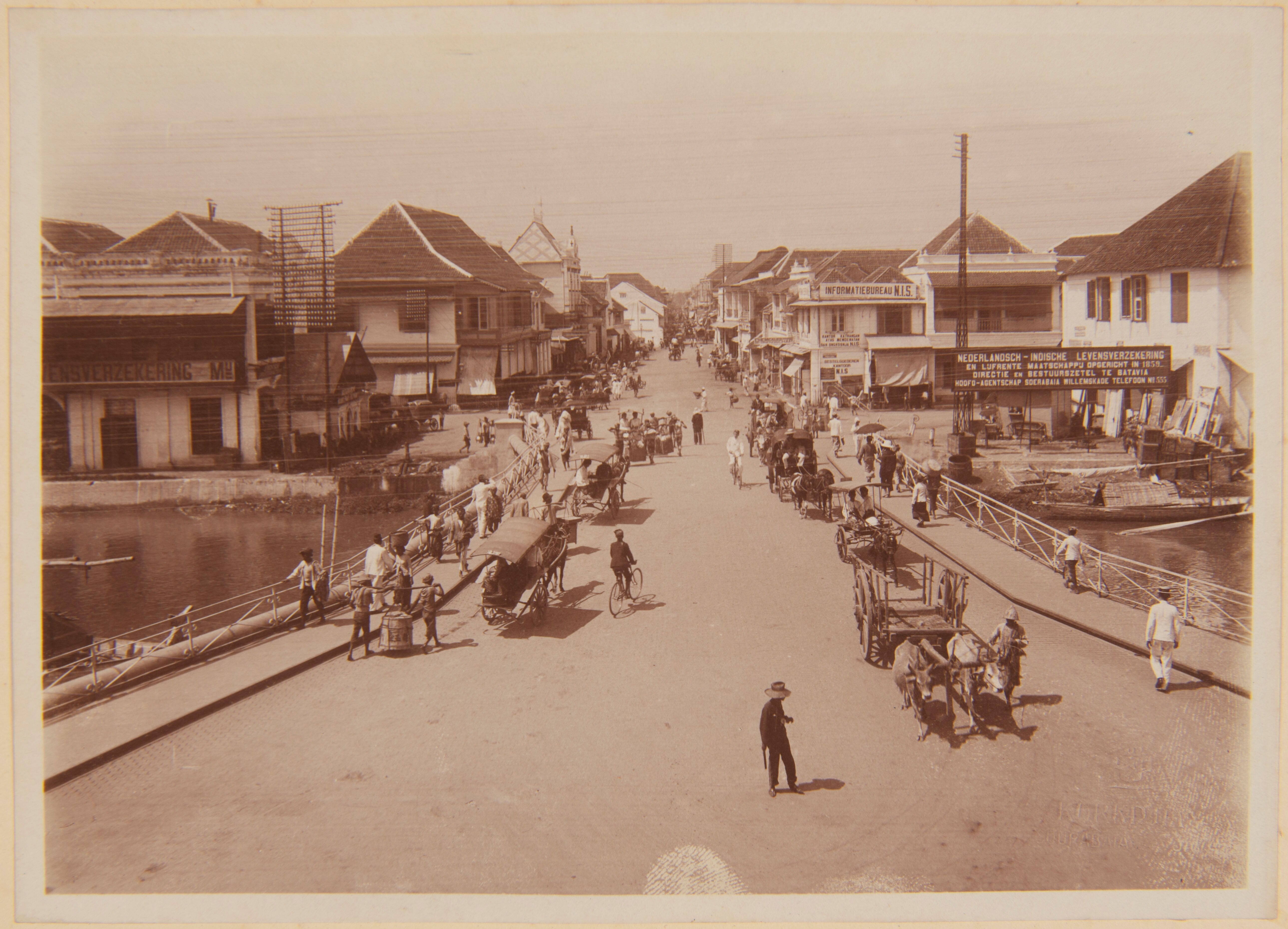 Javanen passeren in Batavia een brug over de kali, m...