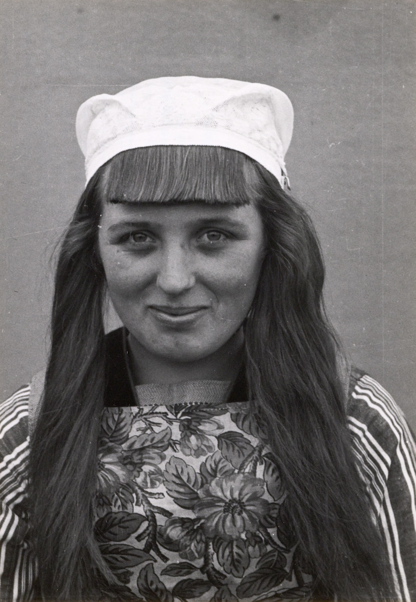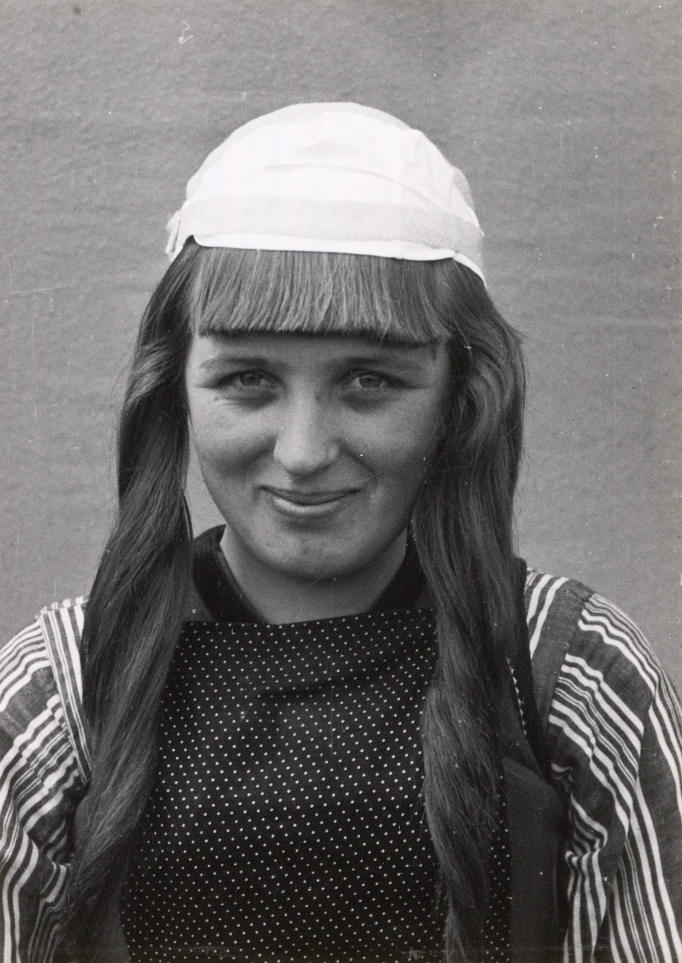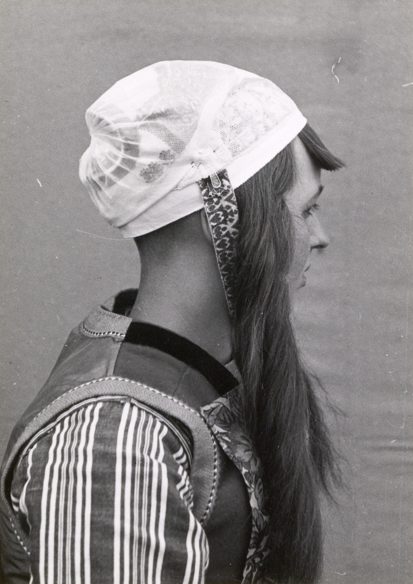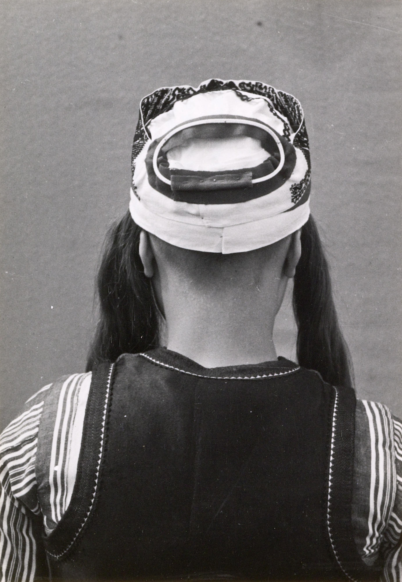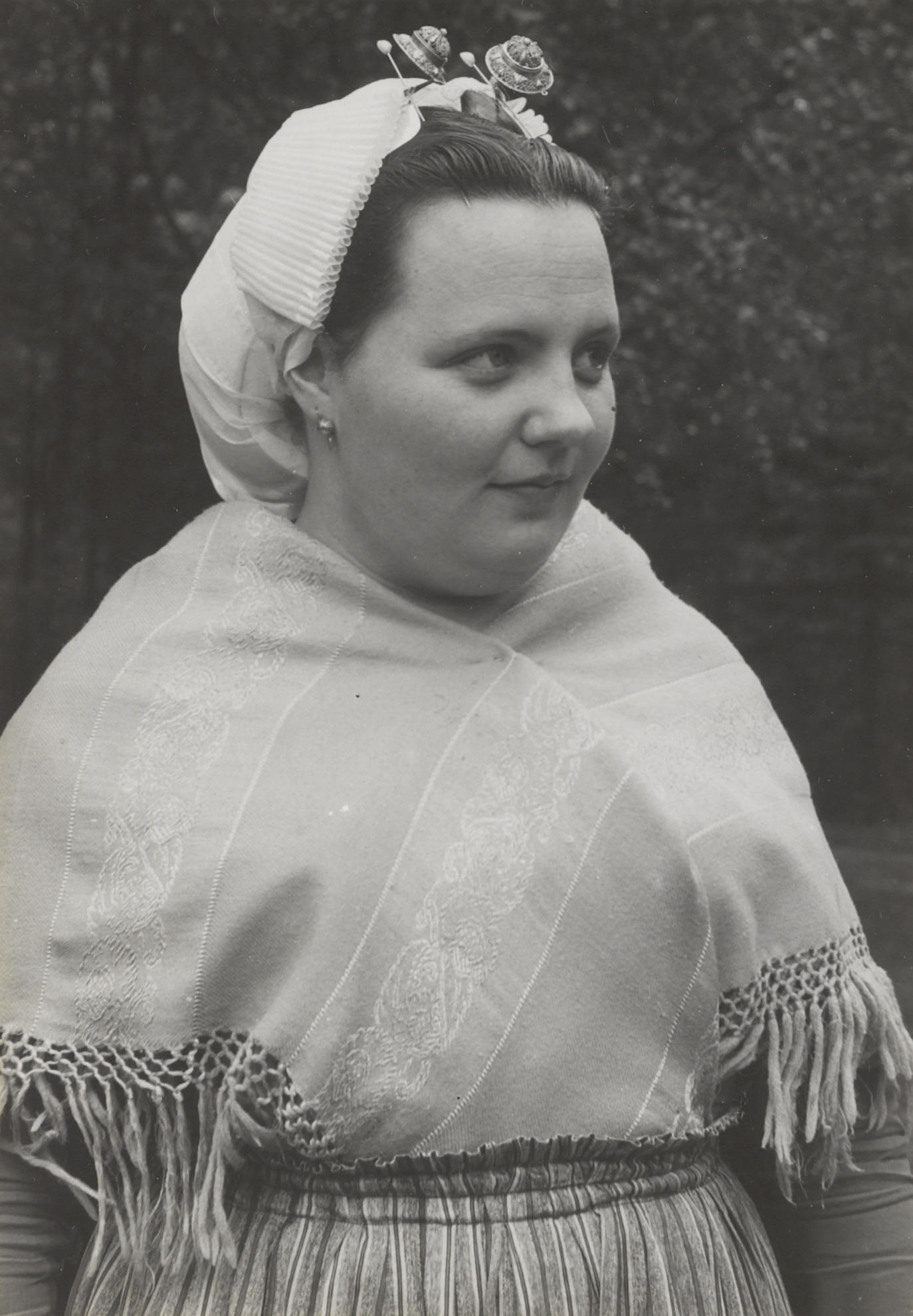 Vrouw in Scheveningse dracht, 1949 (zwart-wit foto)