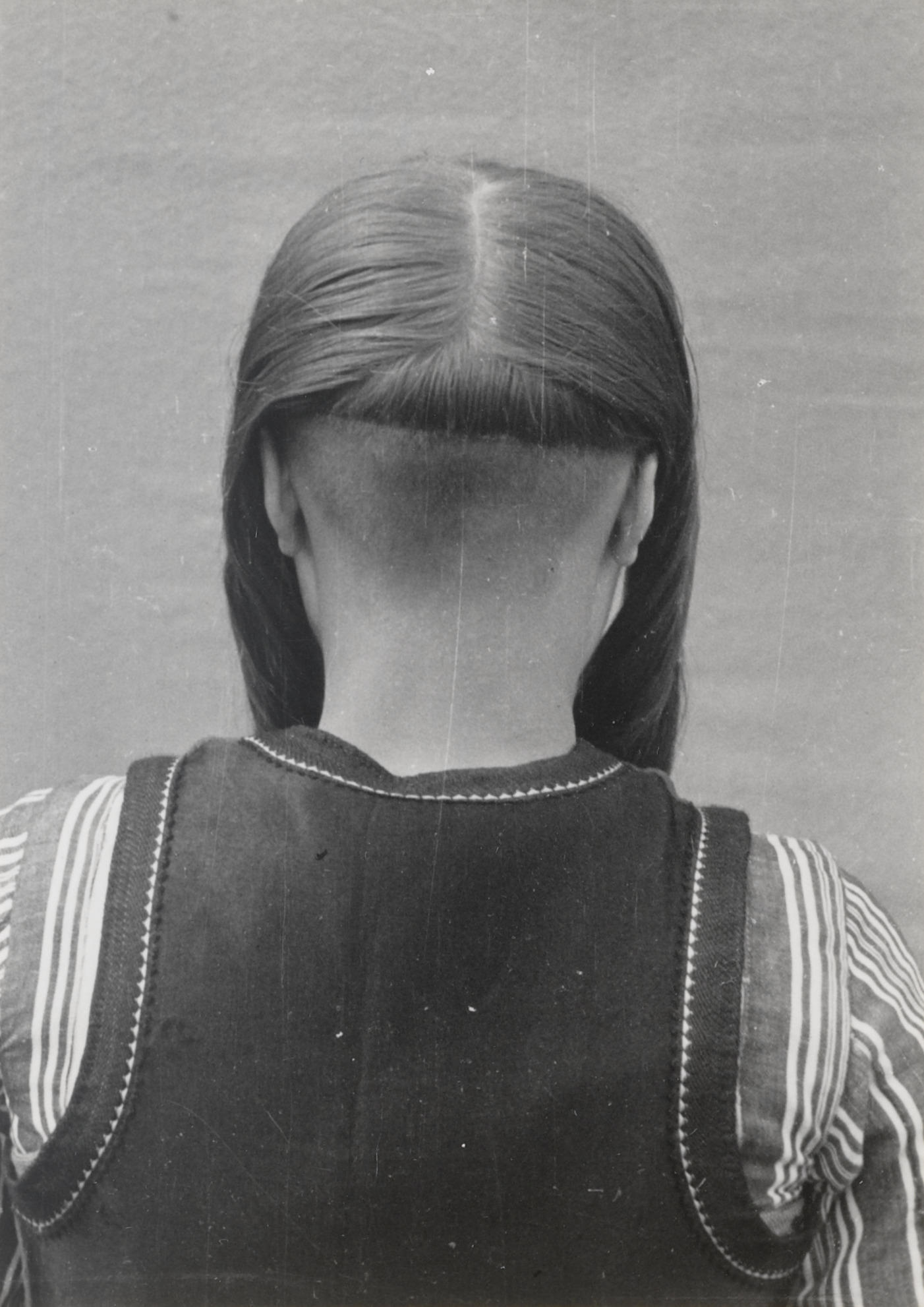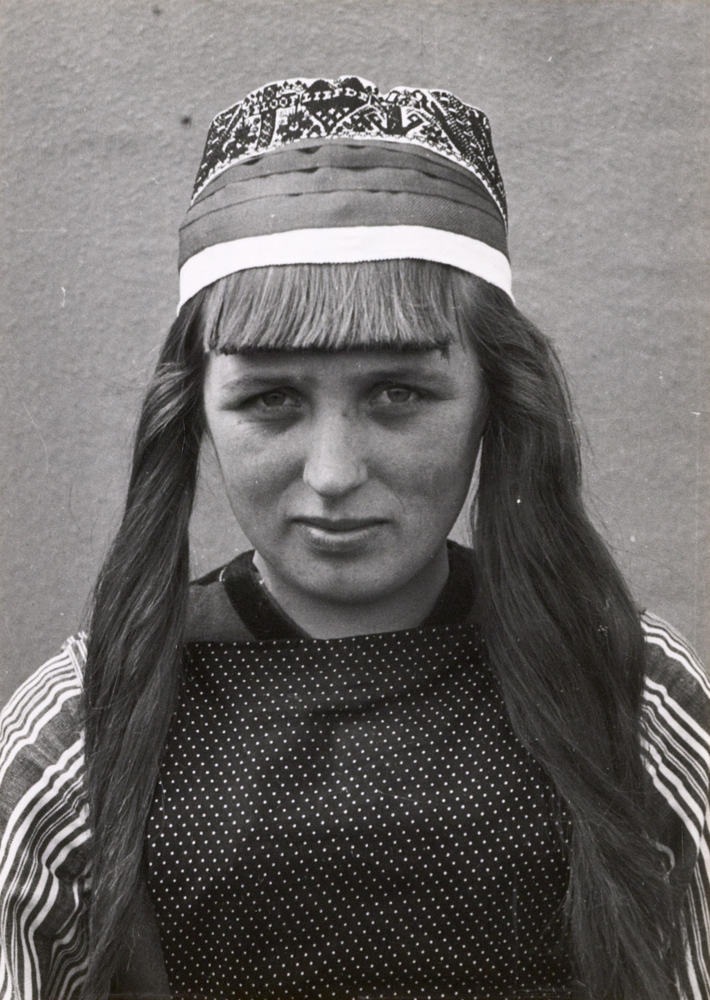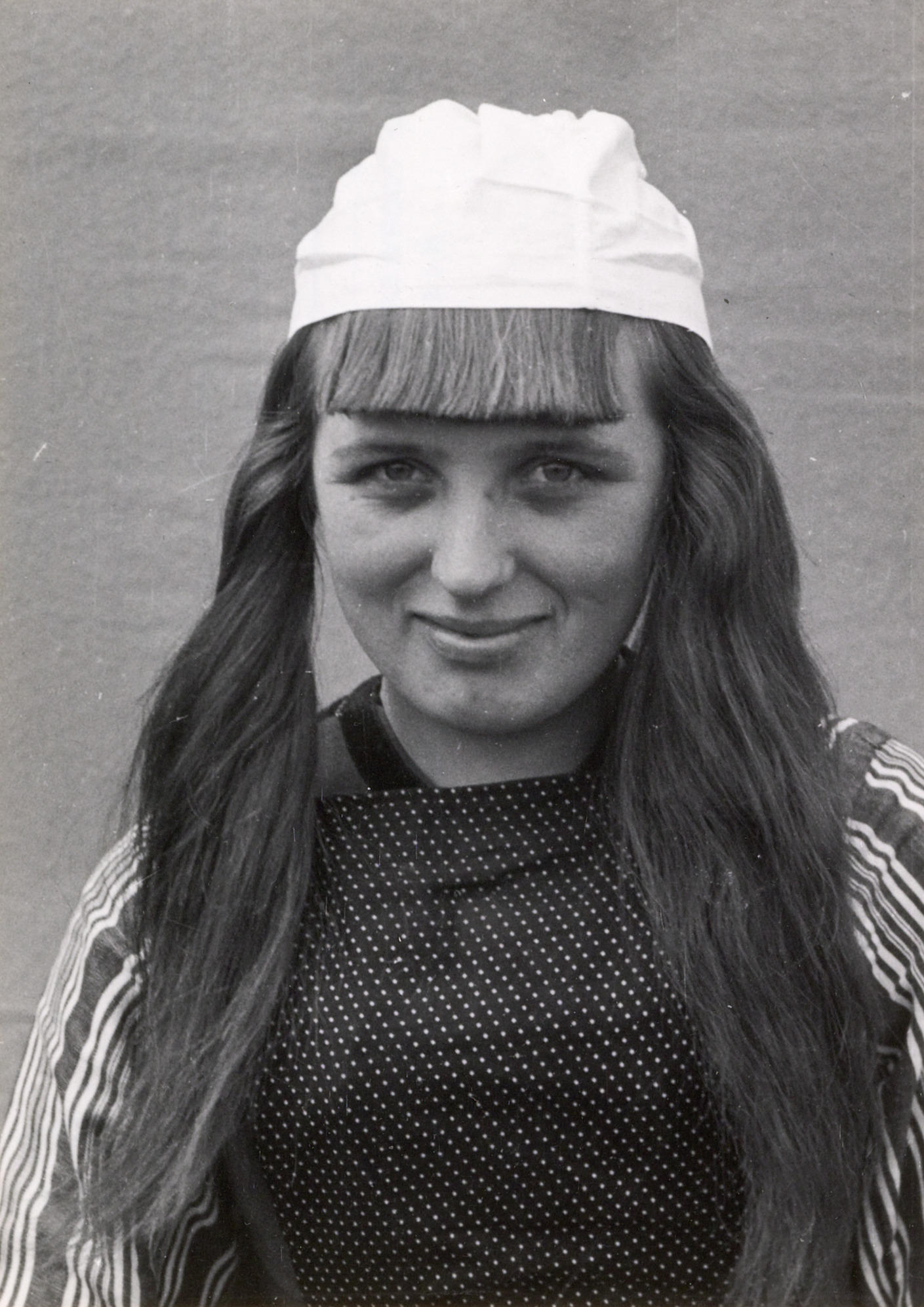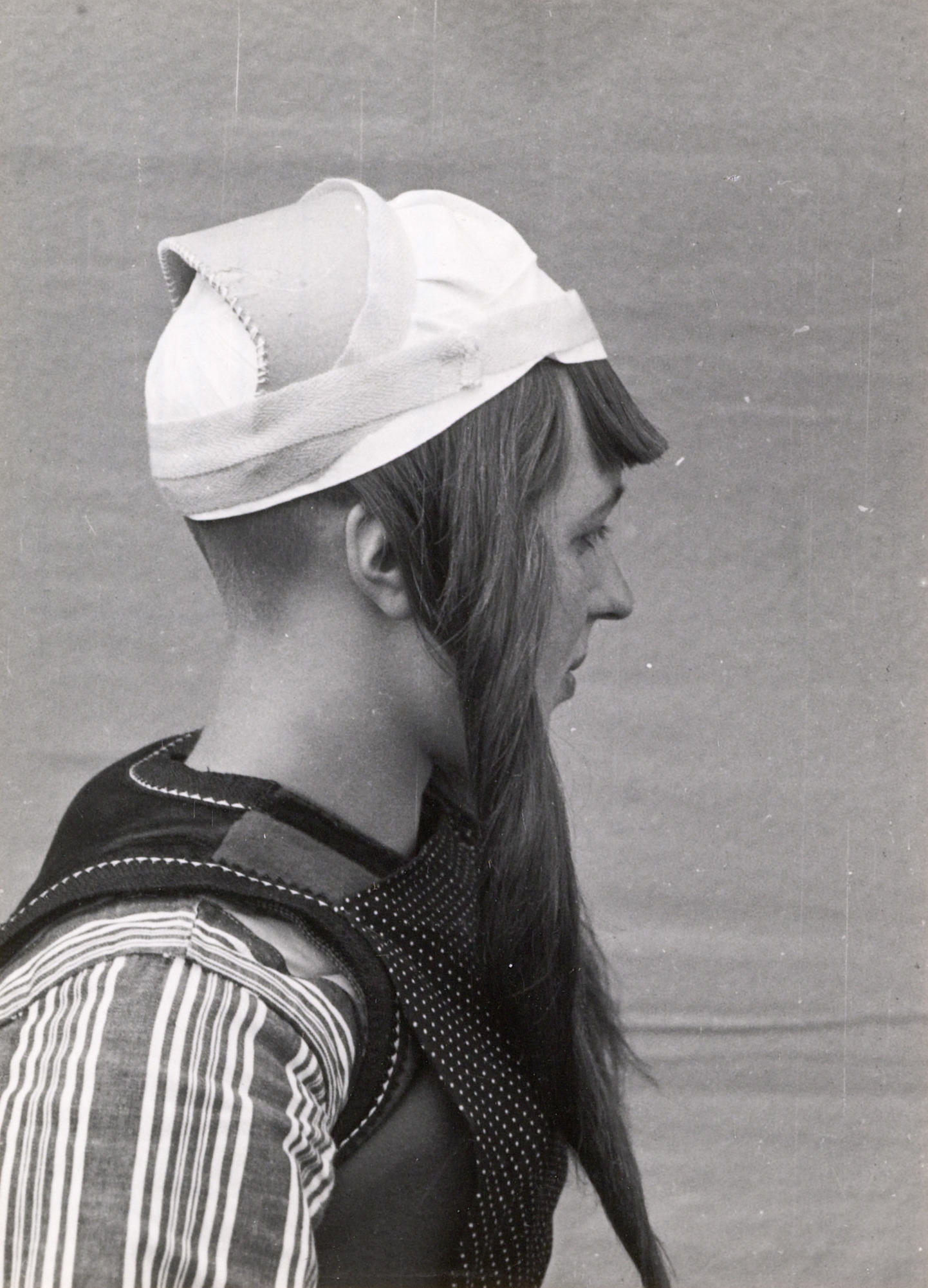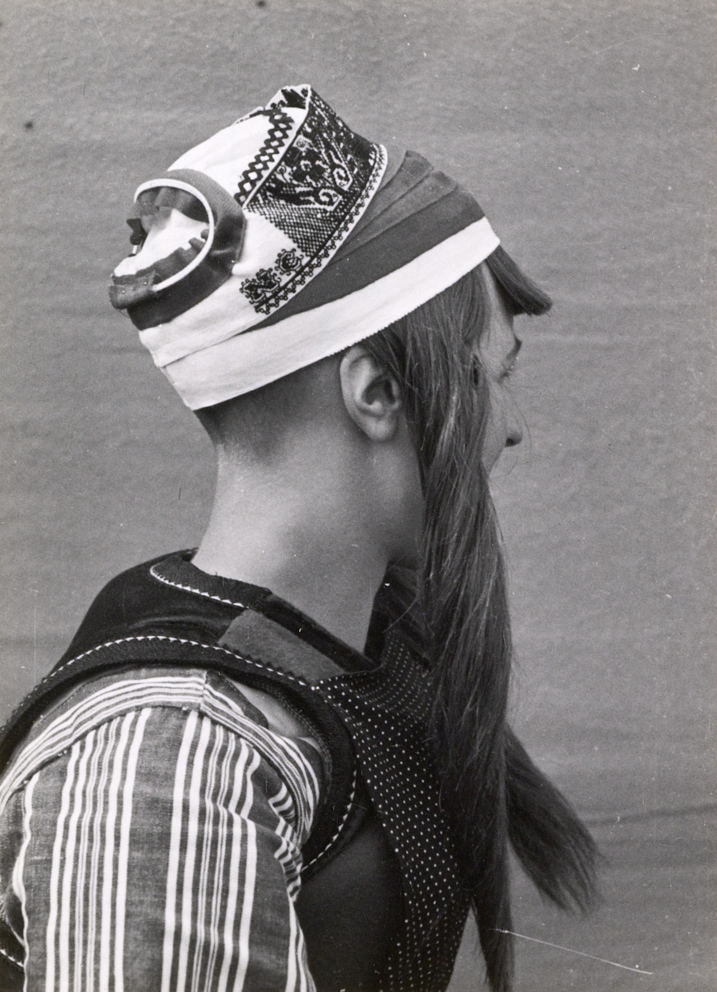 Vrouw in Scheveningse dracht, 1949 (zwart-wit foto)