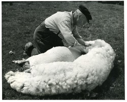 Foto in zwart-wit van het scheren van een schaap doo...