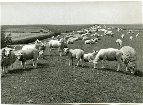 Foto in zwart-wit van schapen en lammeren op een dij...