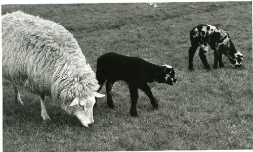 Foto in zwart-wit van een schaap en twee lammeren do...