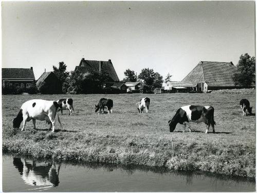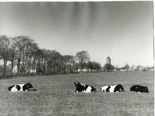 Foto in zwart-wit van koeien in de wei en dorpsgezic...
