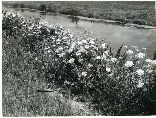 Foto in zwart-wit van een slootkant met bloeiende pl...