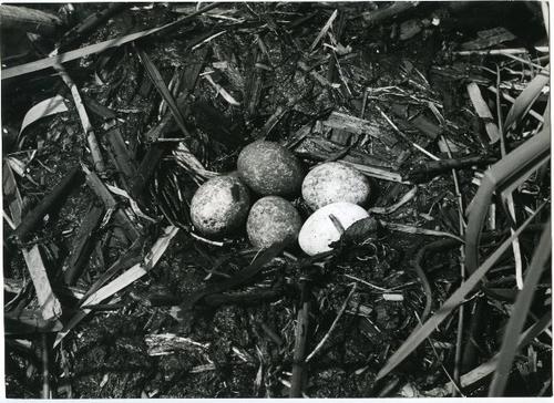 Foto in zwart-wit van het nest van een fuut door J.D...