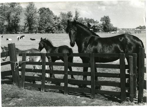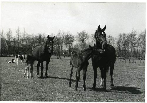 Foto in zwart-wit van twee merries met veulen door J...