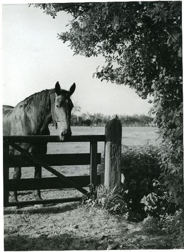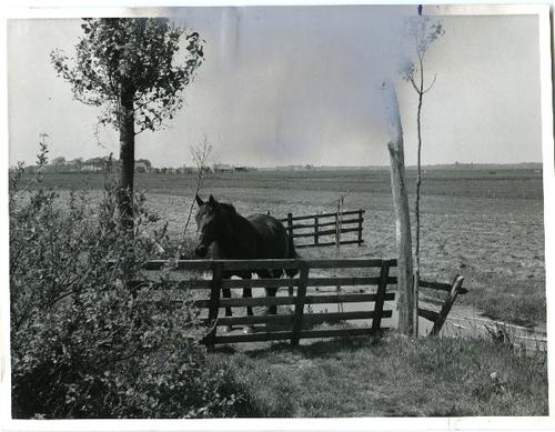 Foto in zwart-wit een paard bij een hek door J.D. de...