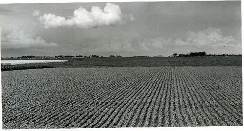 Foto in zwart-wit van een grote aardappelakker door ...