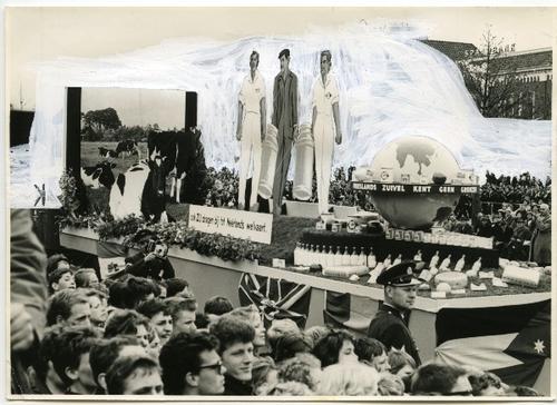 Foto in zwart-wit van een praalwagen met Friese zuiv...