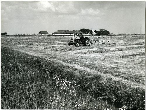 Foto in zwart-wit van een zweler op het hooiland doo...