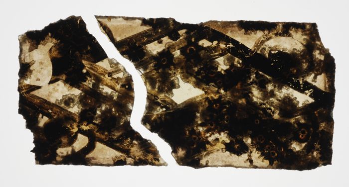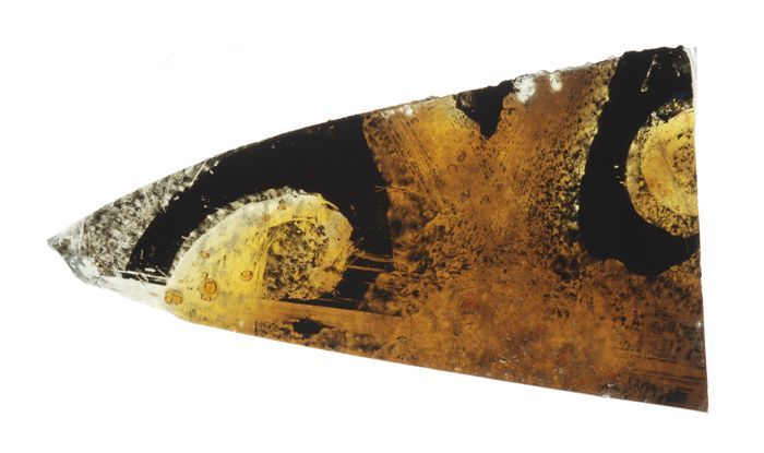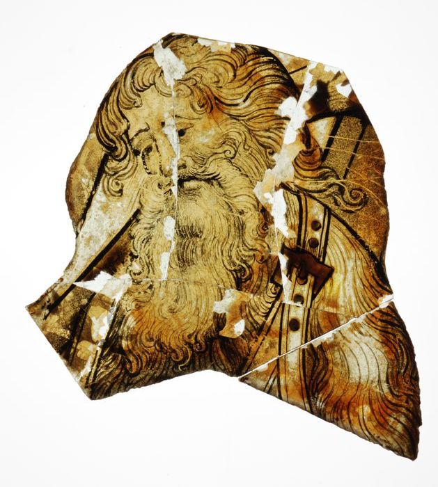 Fragment van groenig vensterglas met gebrandschilder...
