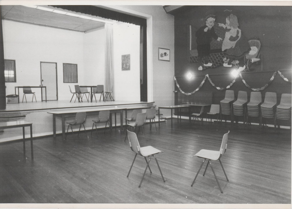 Kijkje in de zaal van het nutsgebouw met het mozaïek...
