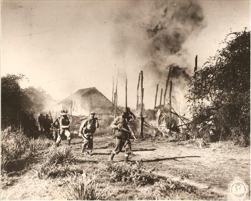 Britse troepen in brandend dorp,Burma