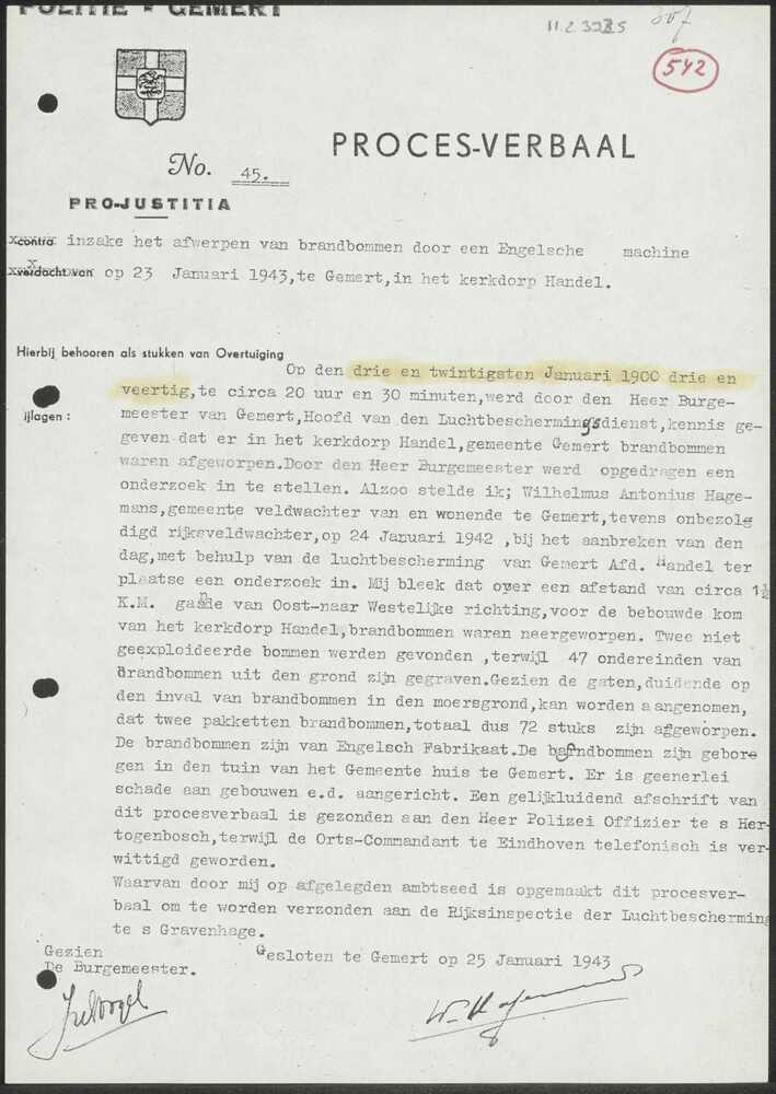 Proces-verbaal No. 45 Politie Gemert 25 januari 1943.