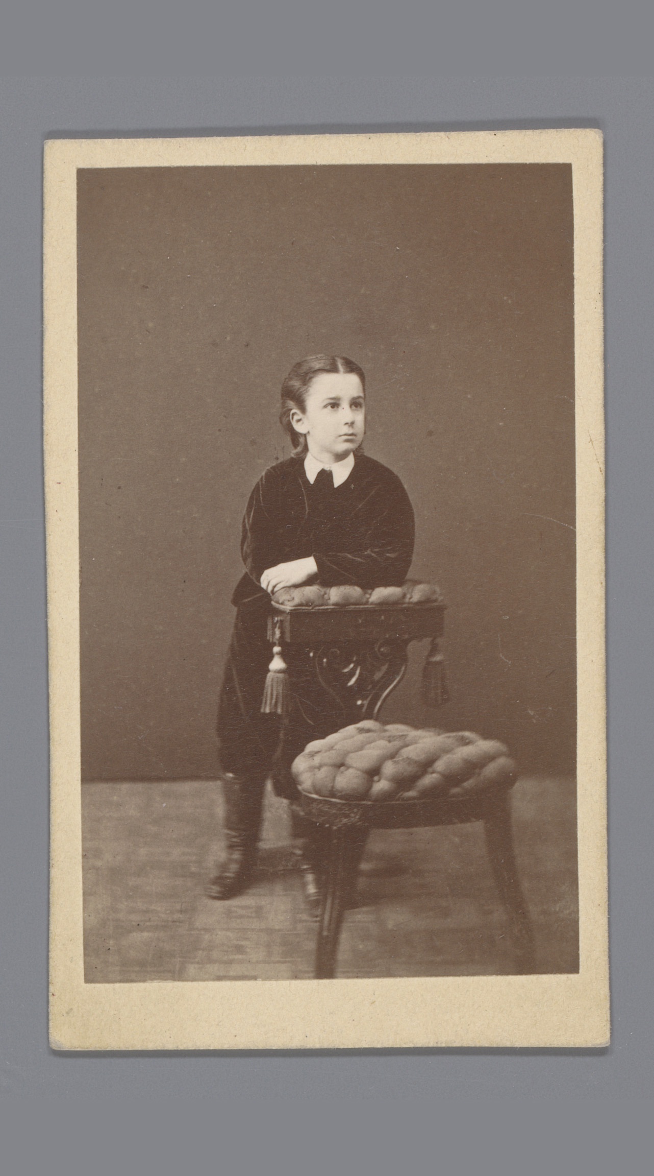 Portret van een onbekende jongen, leunend over een s...