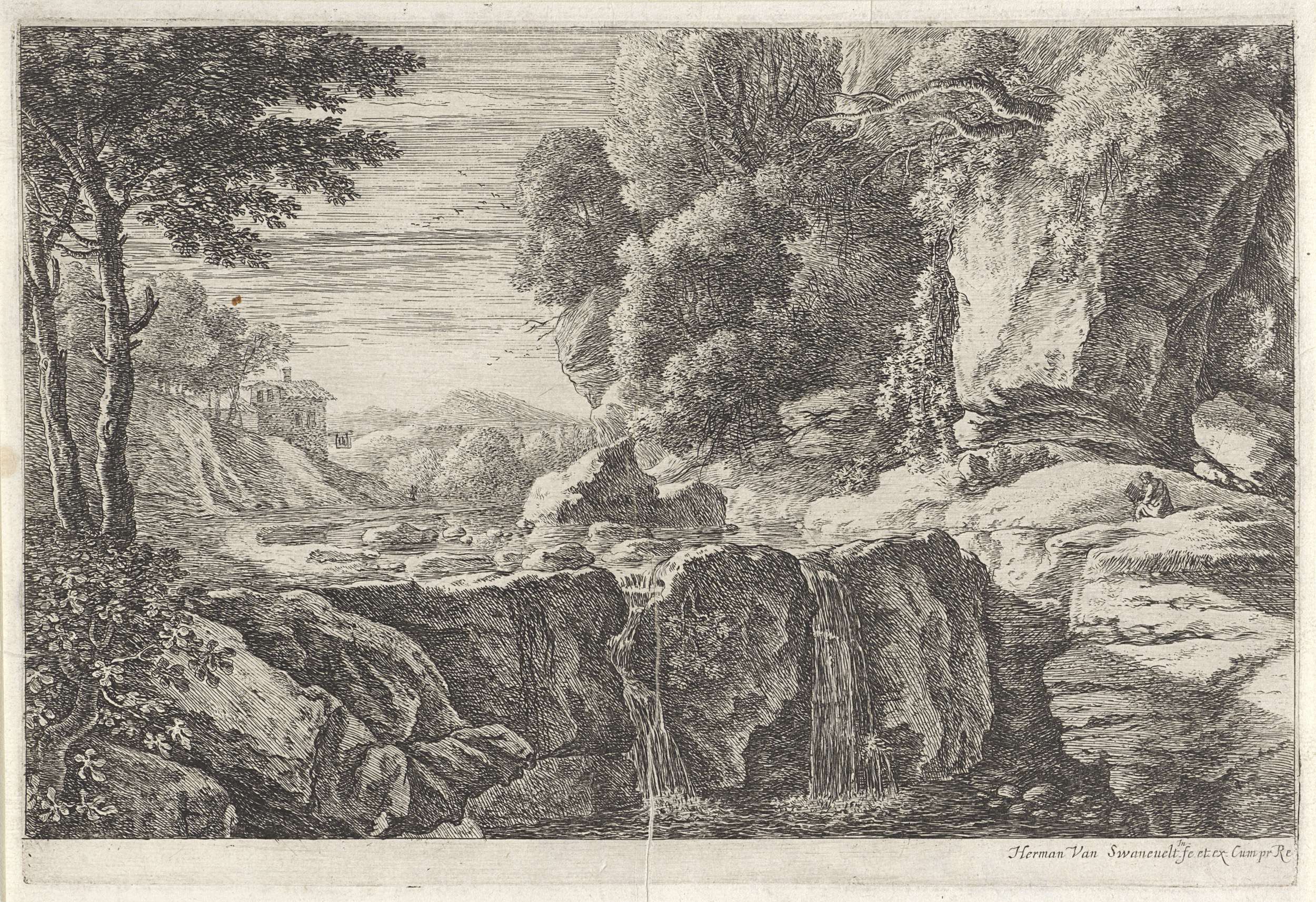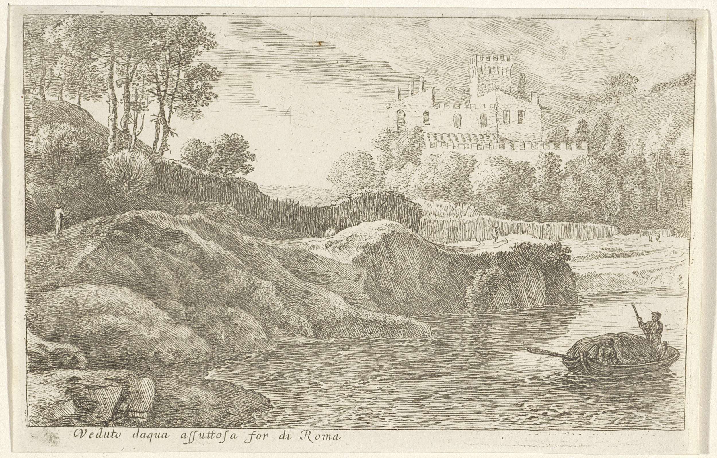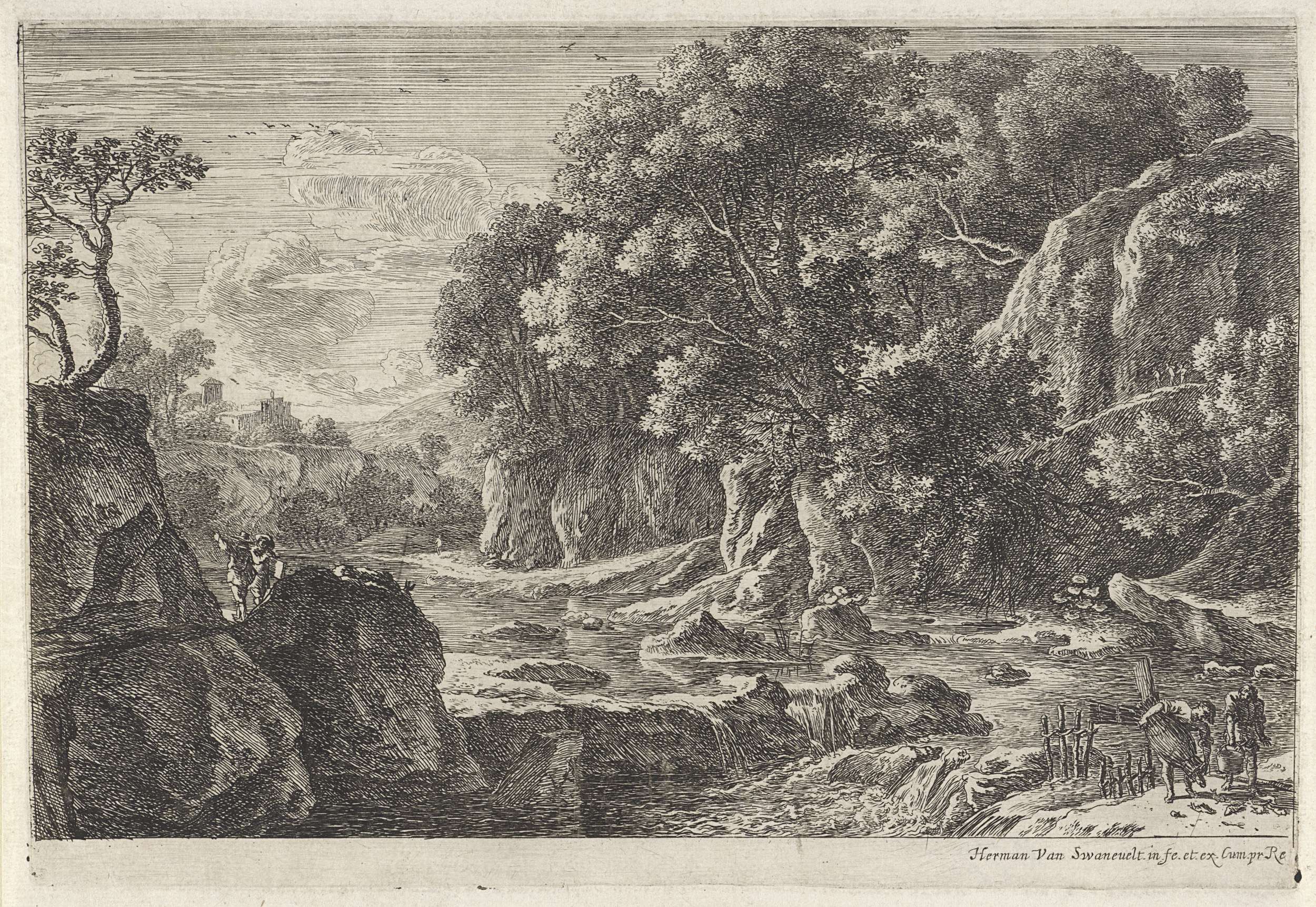 Landschap met figuren aan de waterkant