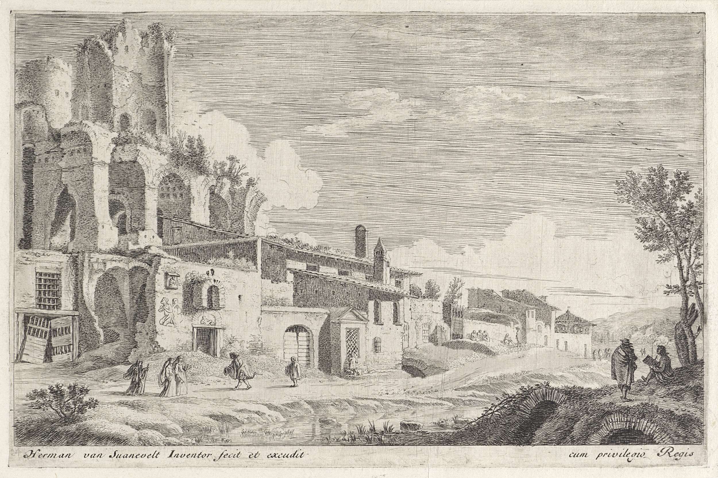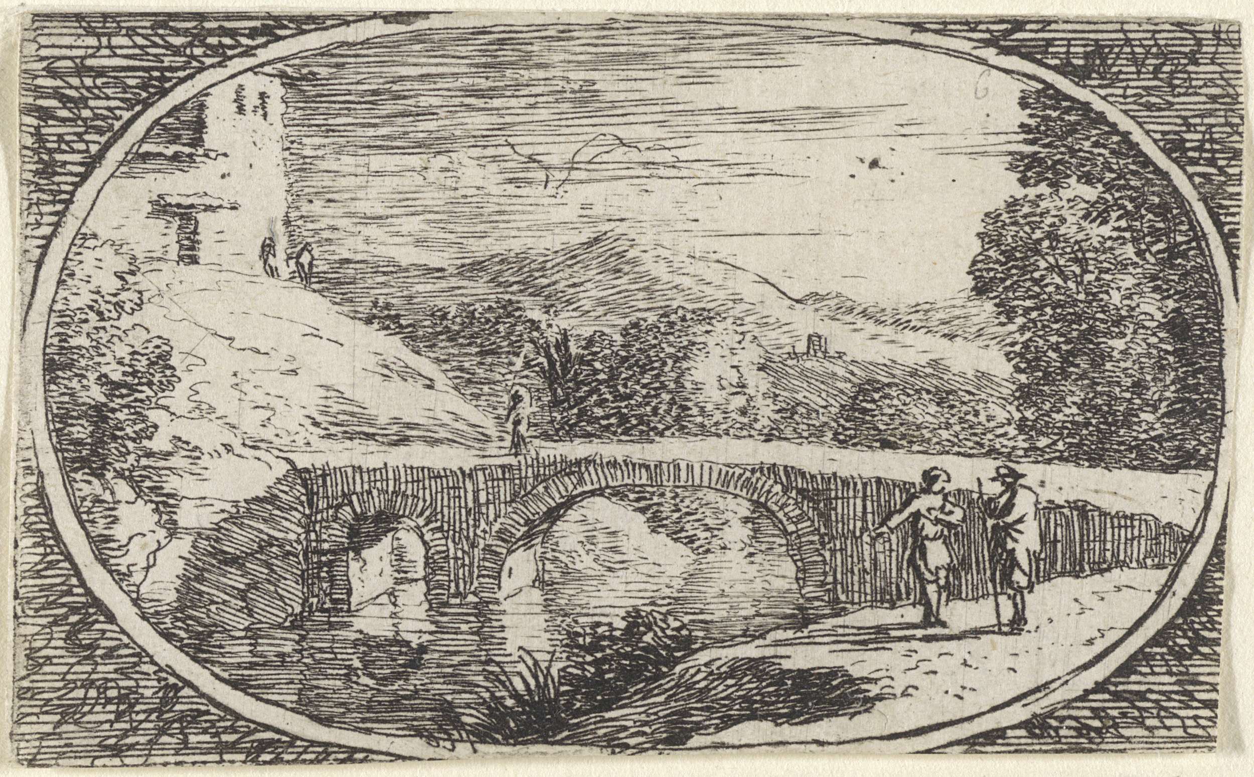 Twee figuren bij een stenen brug