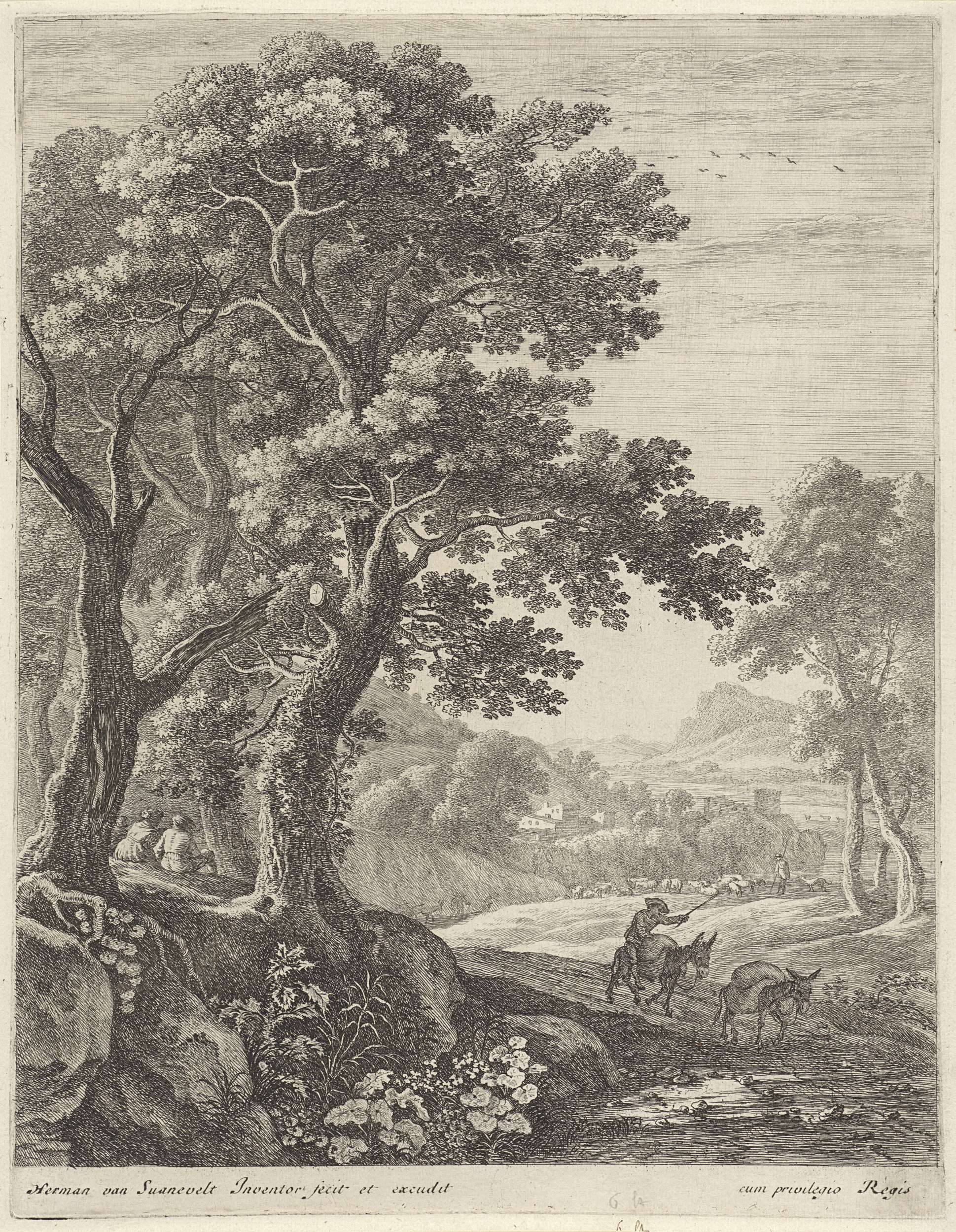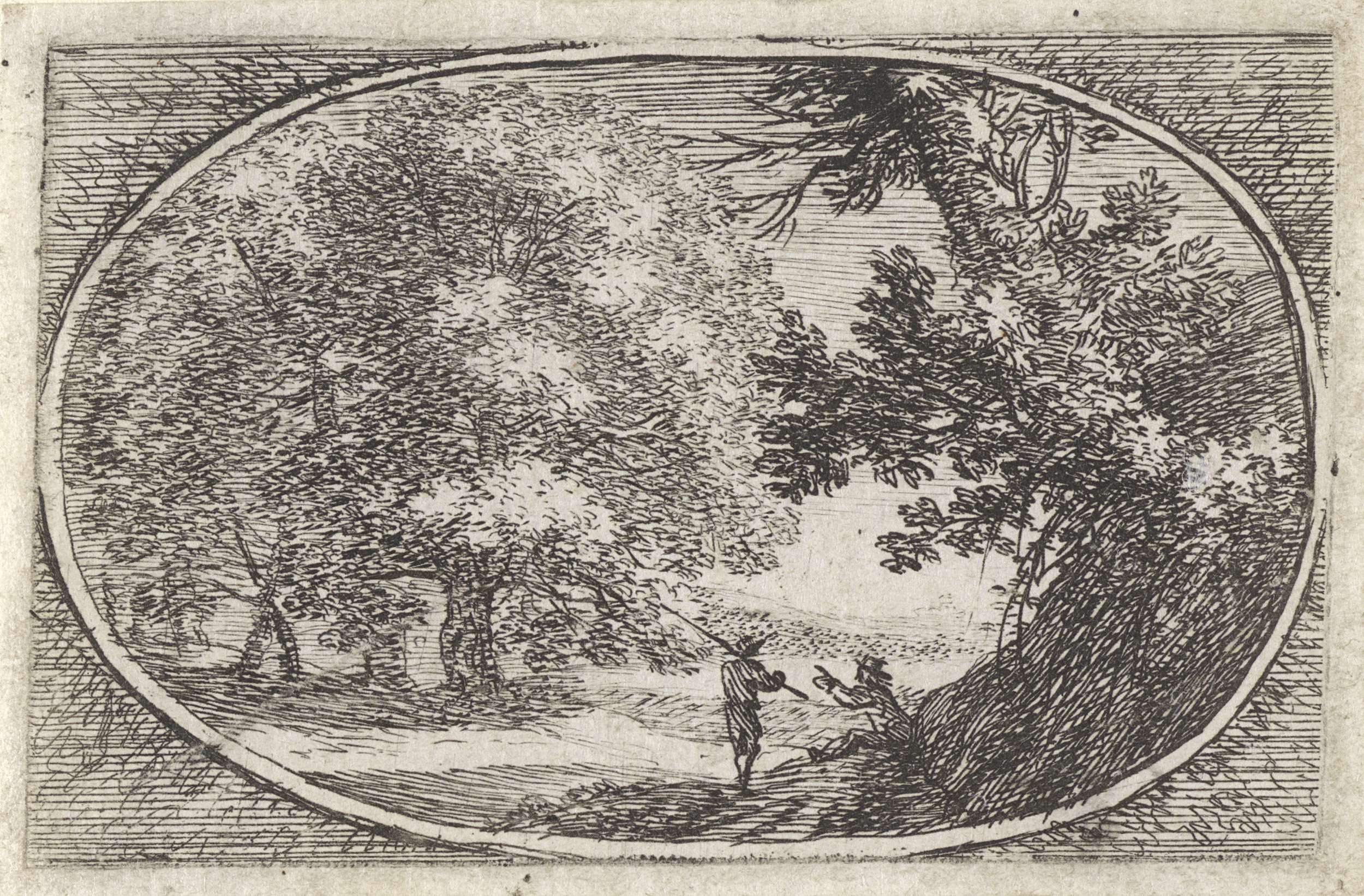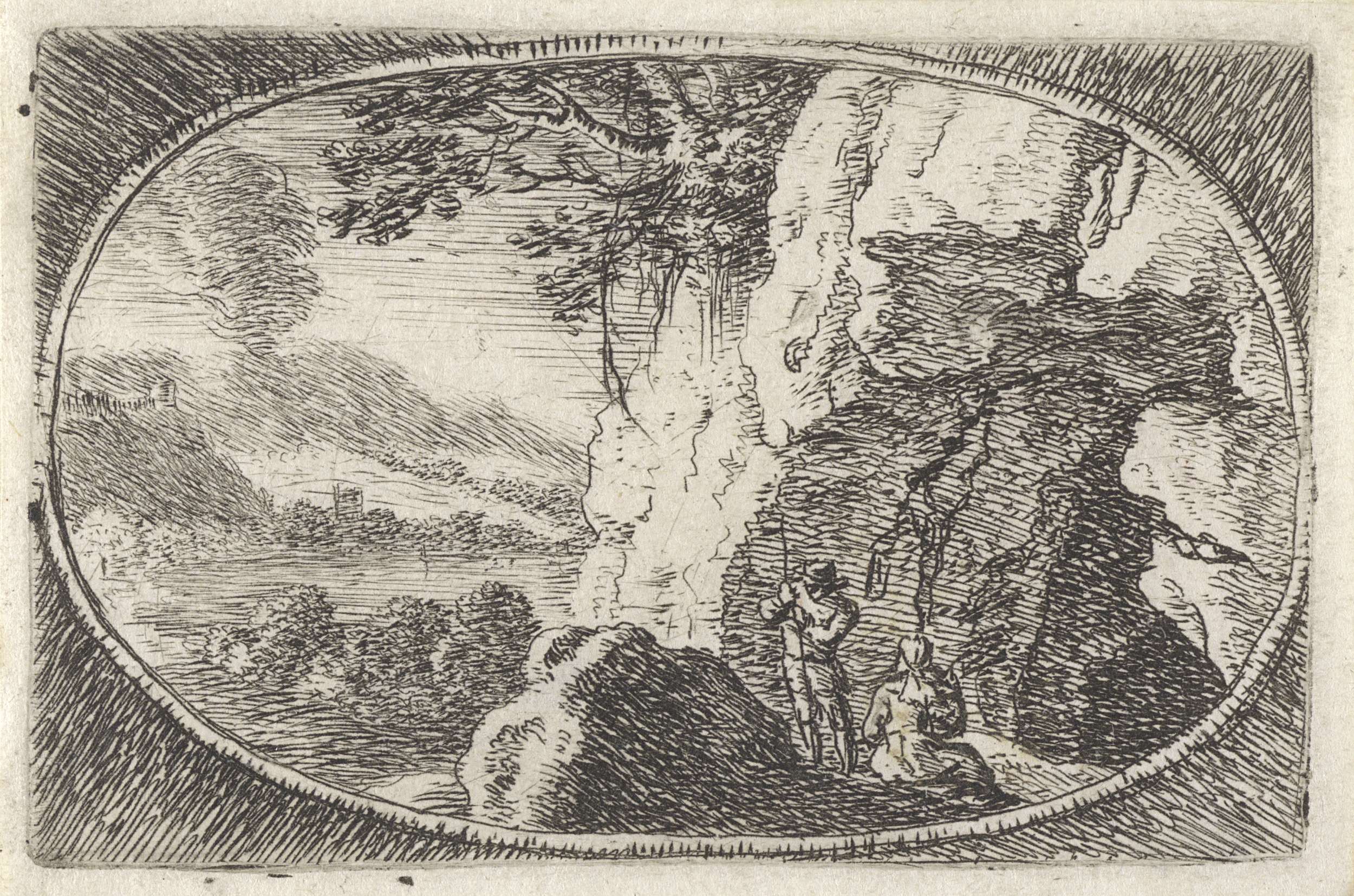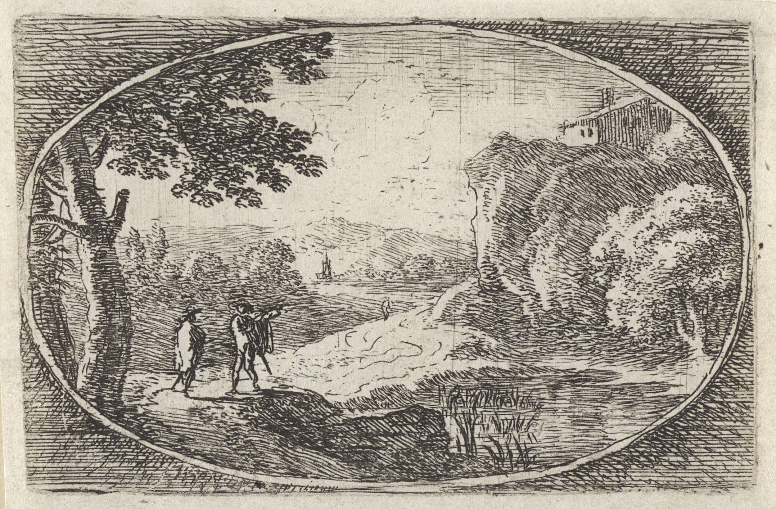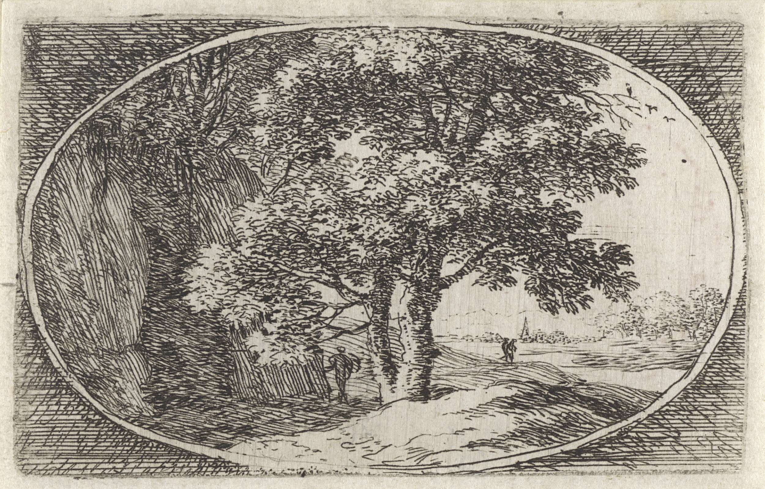 Landschap met twee figuren onder een boom