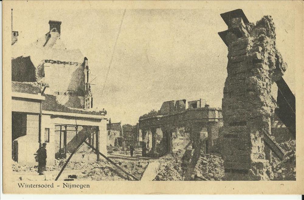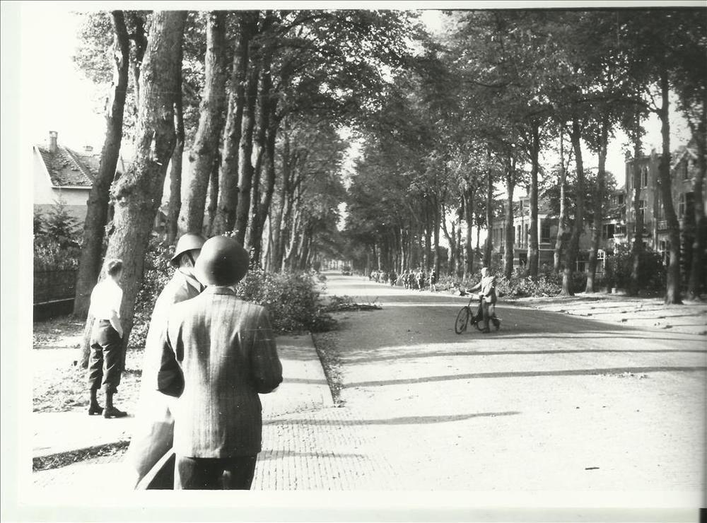 Nijmegen, straat met bomen, 2 verzetsmensen; Amerika...
