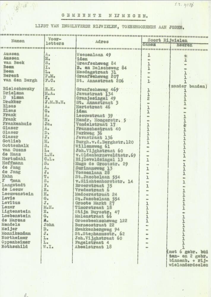 Gemeente Nijmegen, lijst van ingeleverde rijwielen, ...