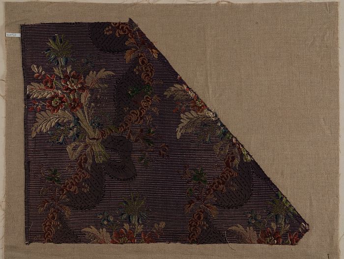 Textielfragment van gebrocheerde lila zijde met groo...