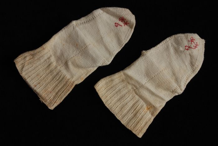 Paar witte gebreide kindersokken met boord en gebord...