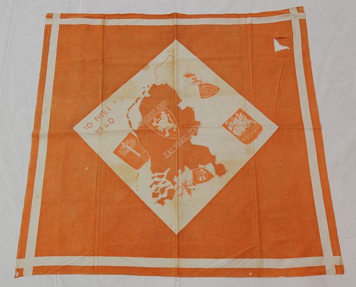 Oranje en wit dekservet met "NEDERLAND ZAL HERRIJZEN...