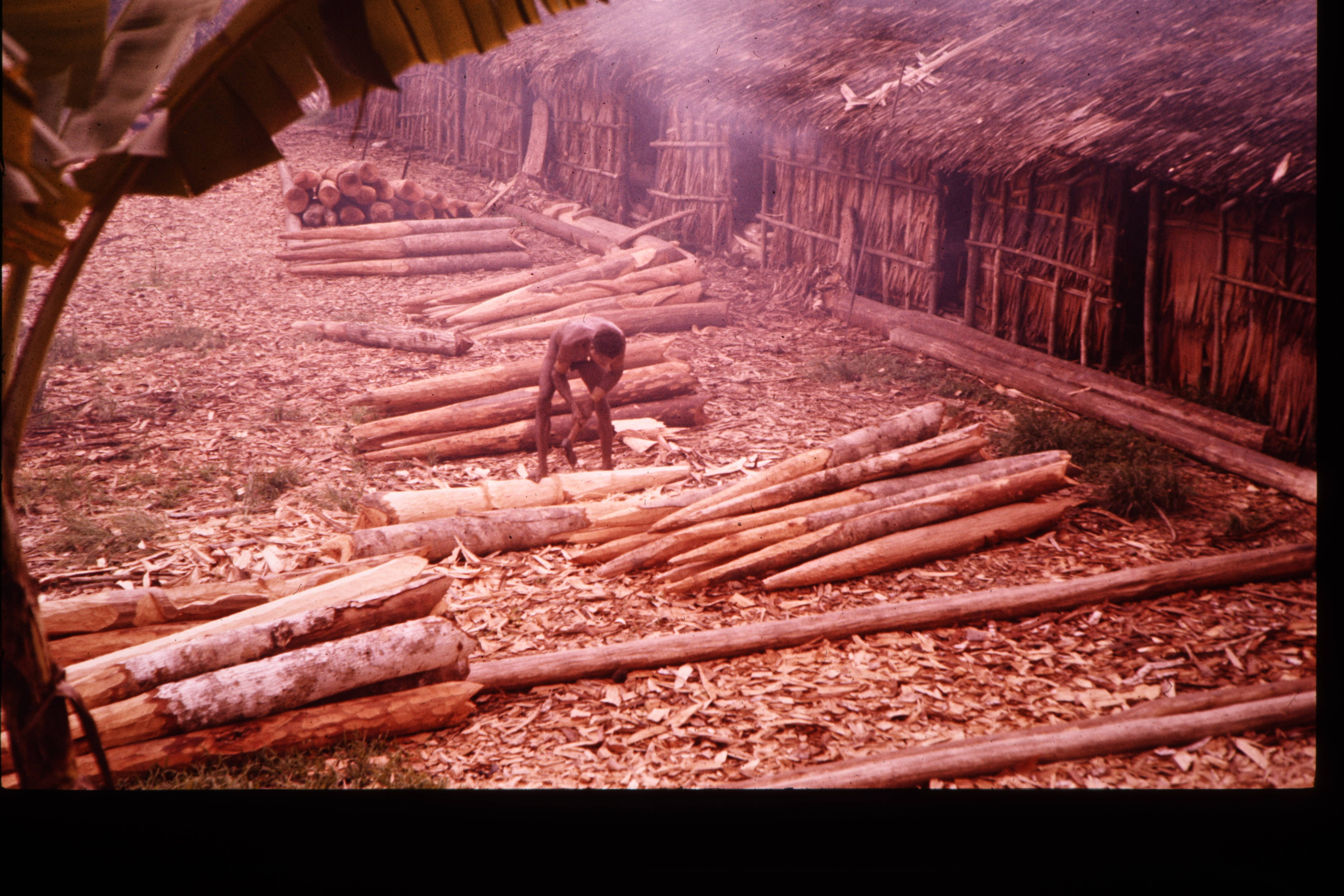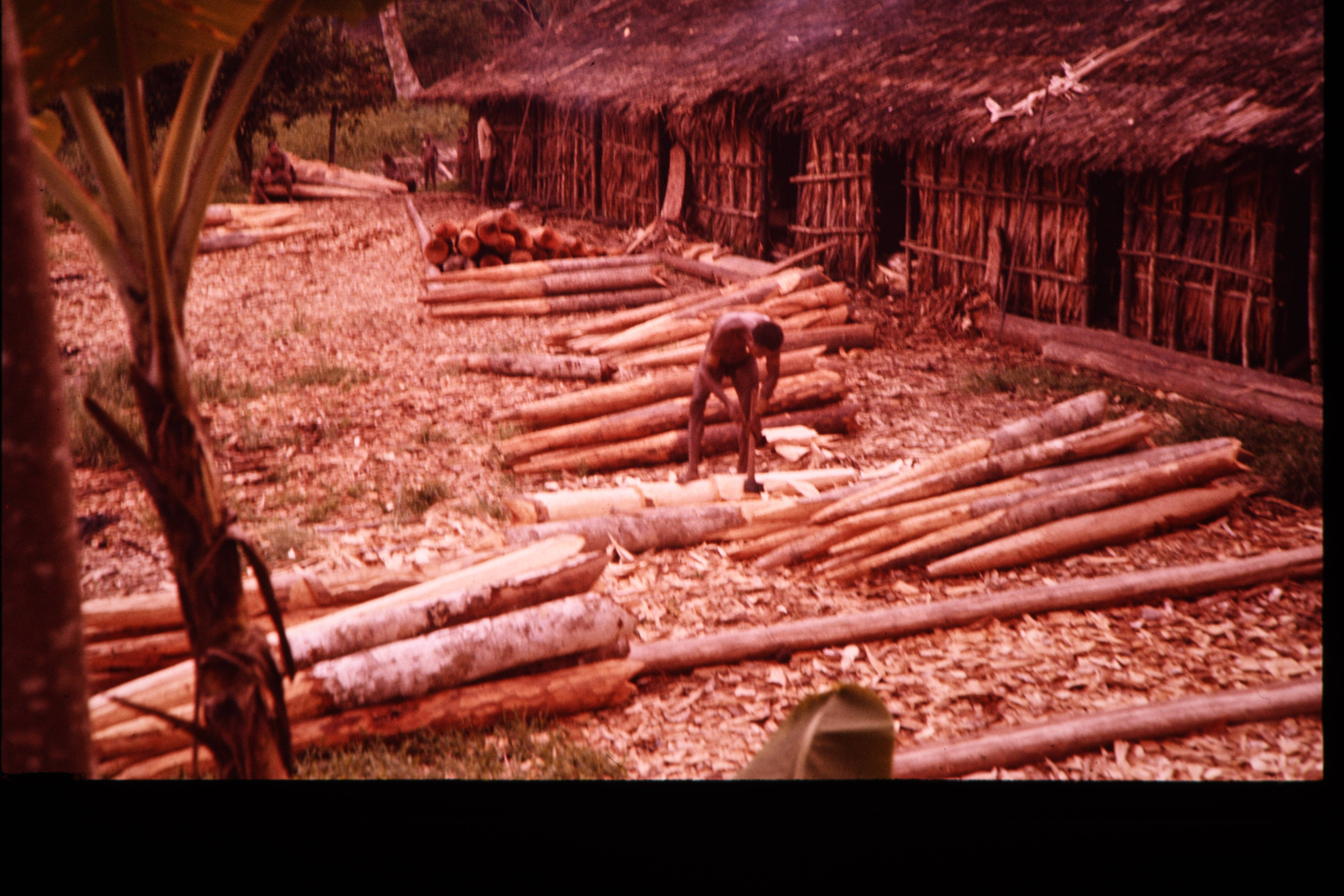 Overzicht voorplein jö Amman met stapels huispalen, ...
