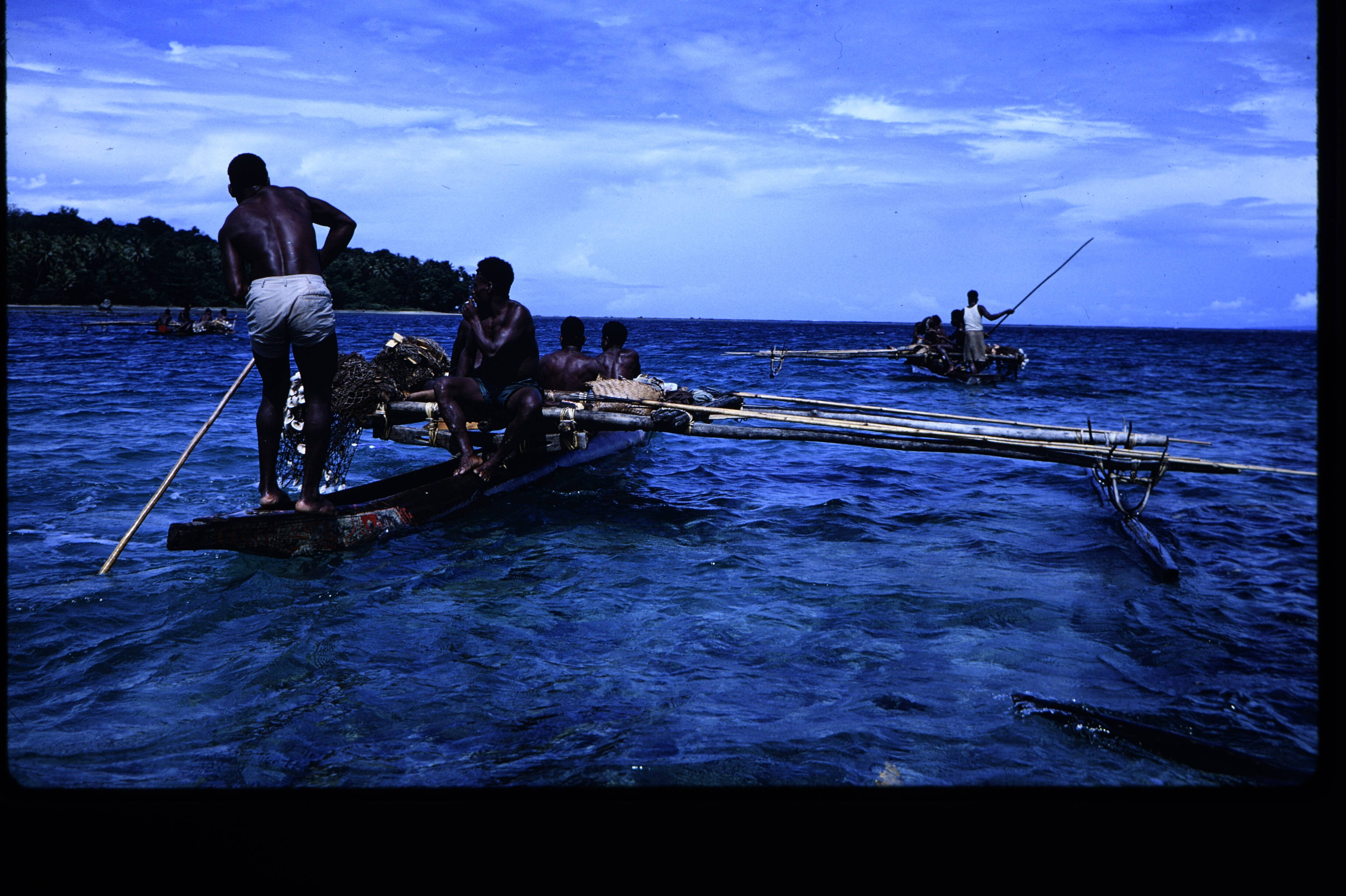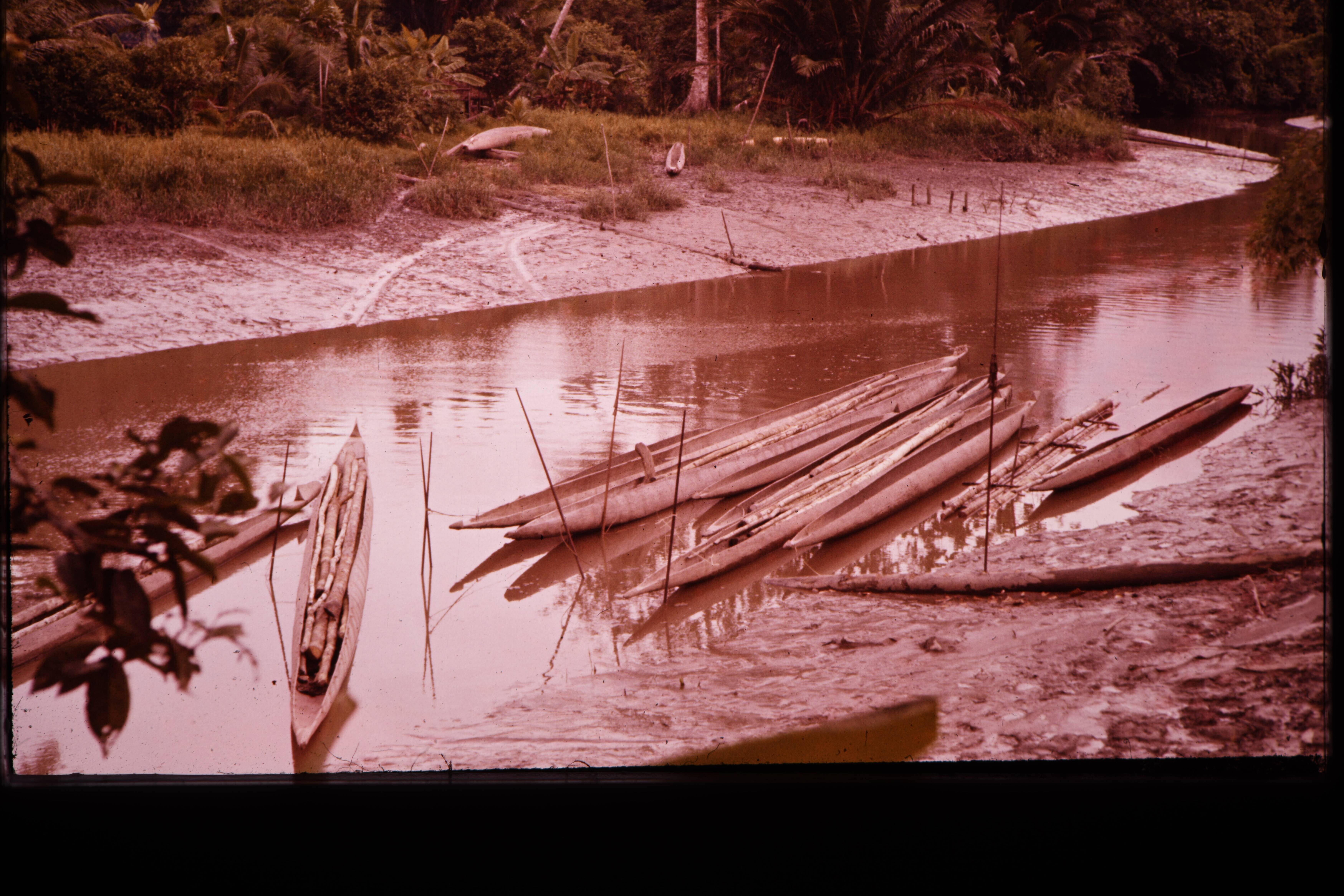 Prauwen geladen met lange palen voor de nieuwe jö Am...