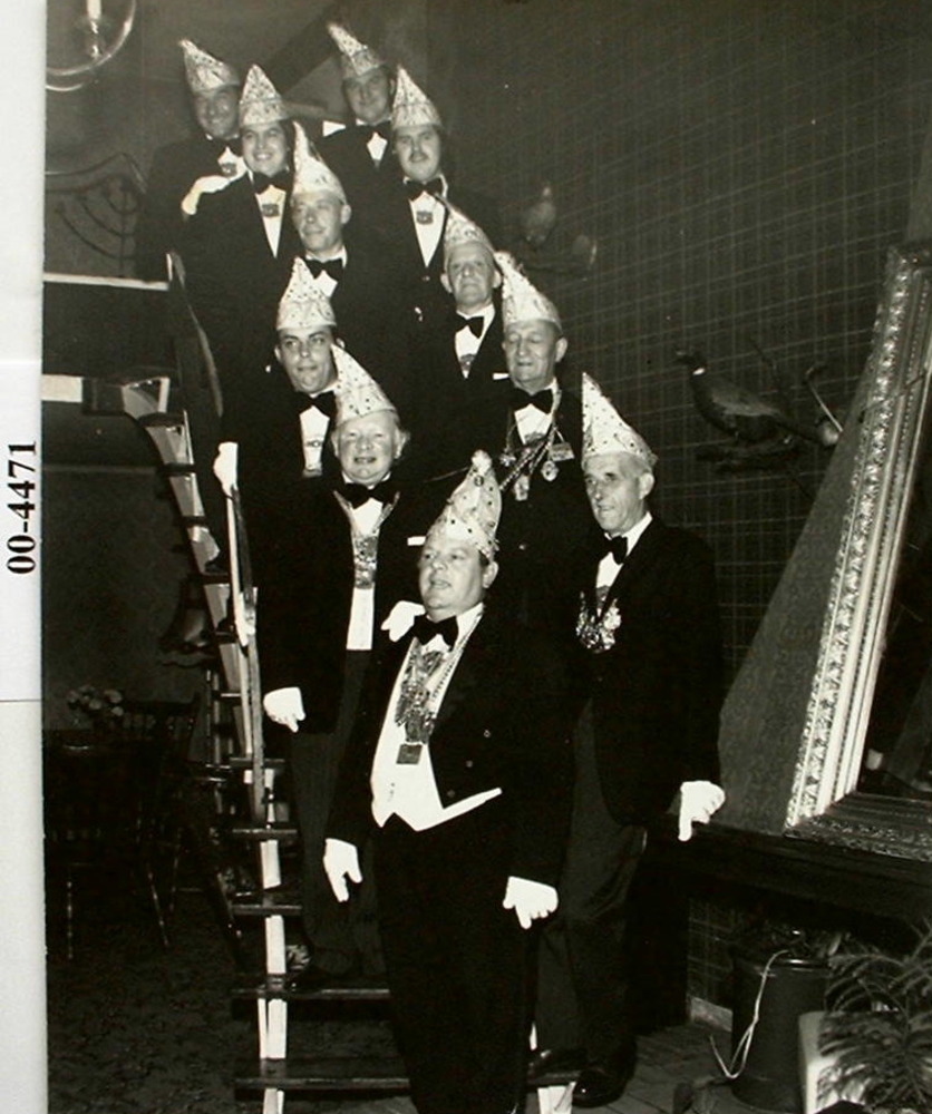 Raad van elf in de Blauwe Engel op de trap van de Bu...