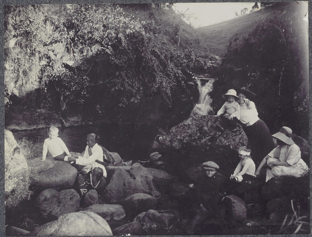 Vrouwen, kinderen en kinderverzorgster tijdens een b...