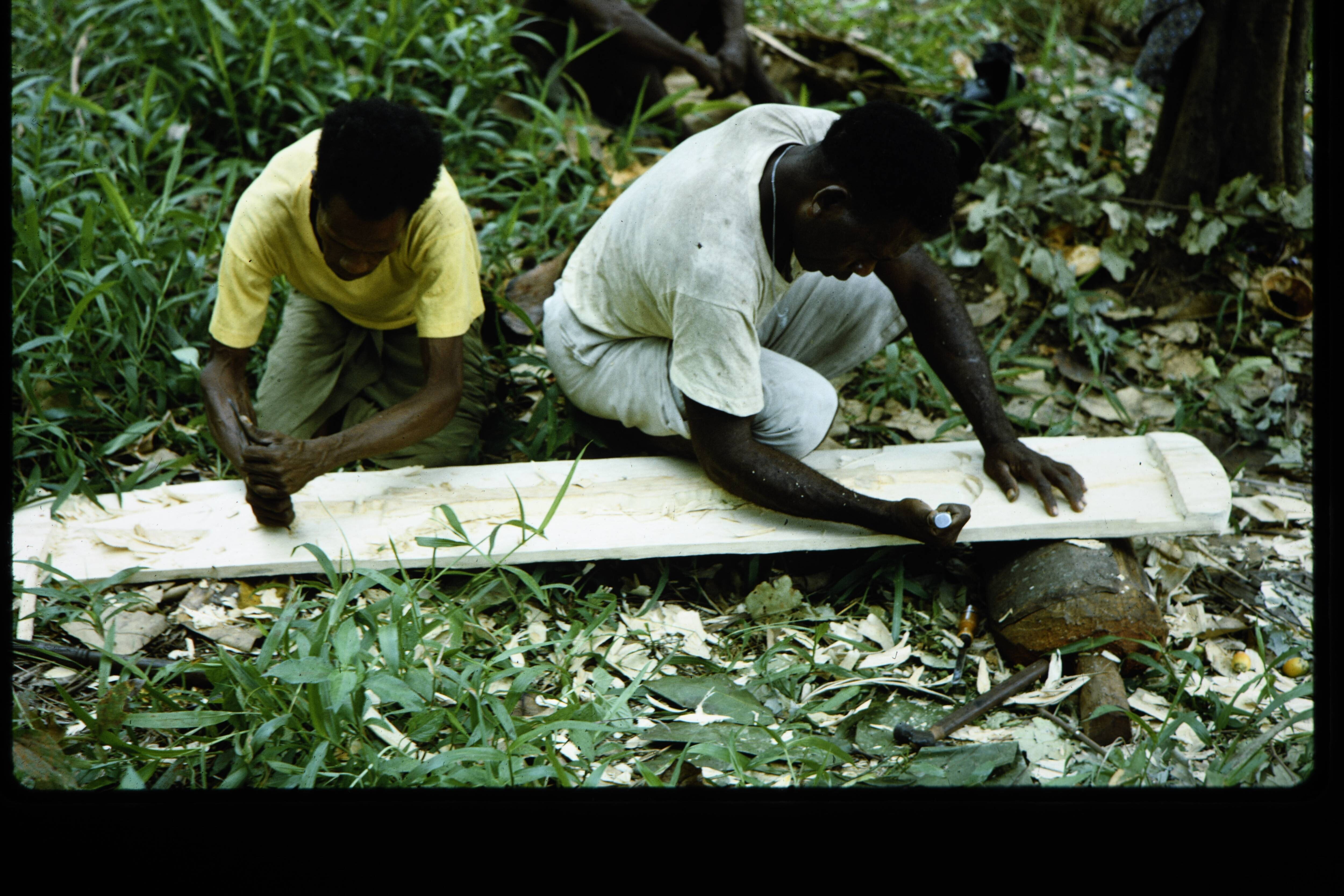 Tekamèn bezig de buitenhuid van het prauwtje van Jok...