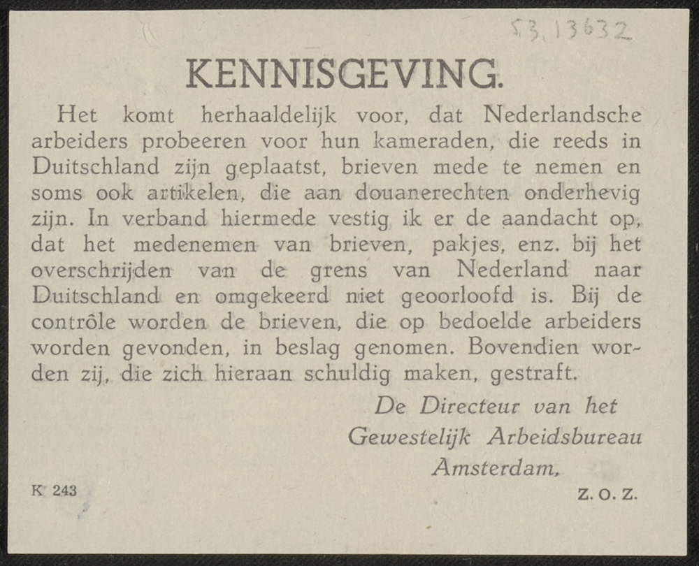 Kennisgeving dat het verboden is brieven of pakjes m...