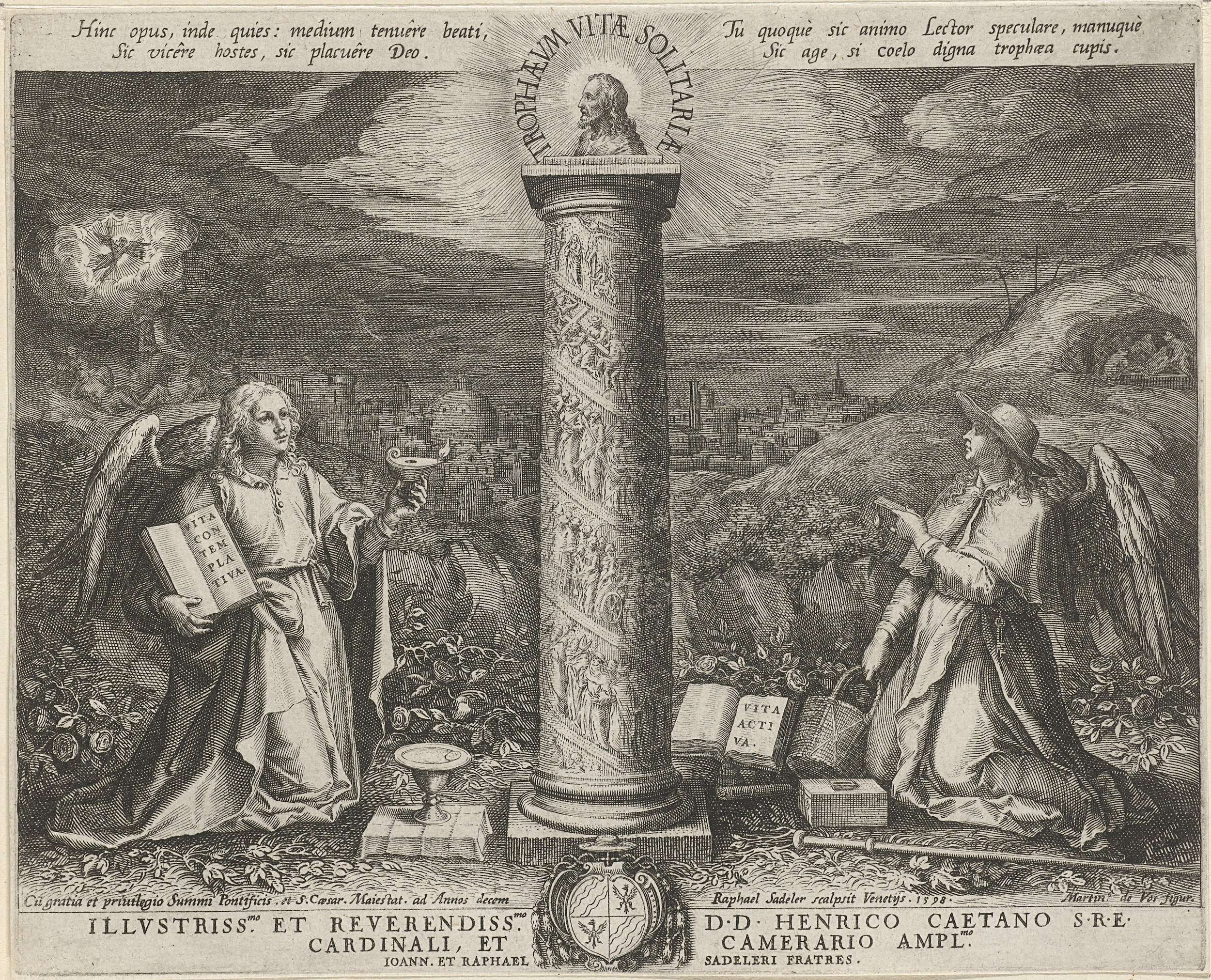 Twee engelen aanbidden een zuil