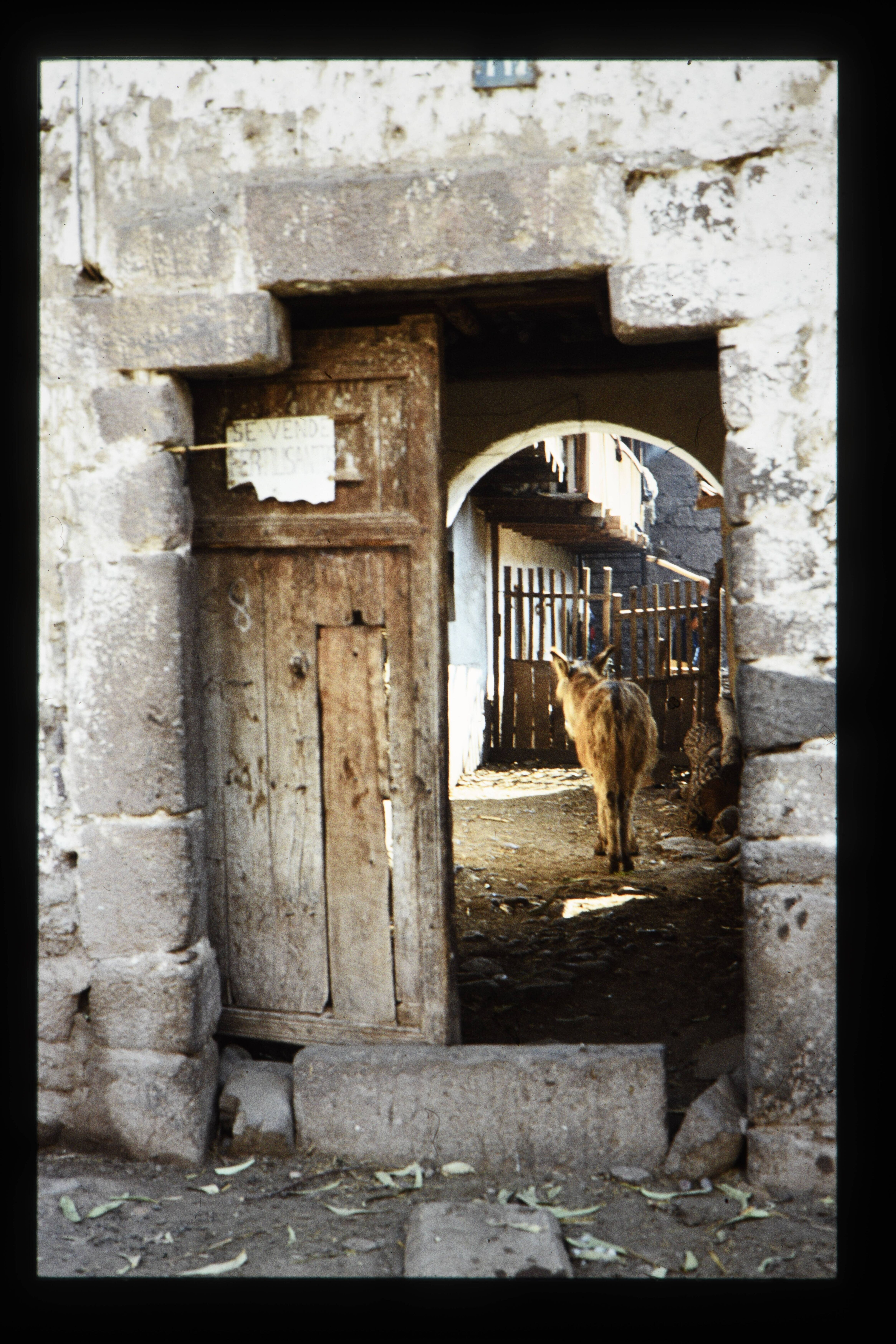 'Gezicht op omringend bergland a/d rand van de stad.'
