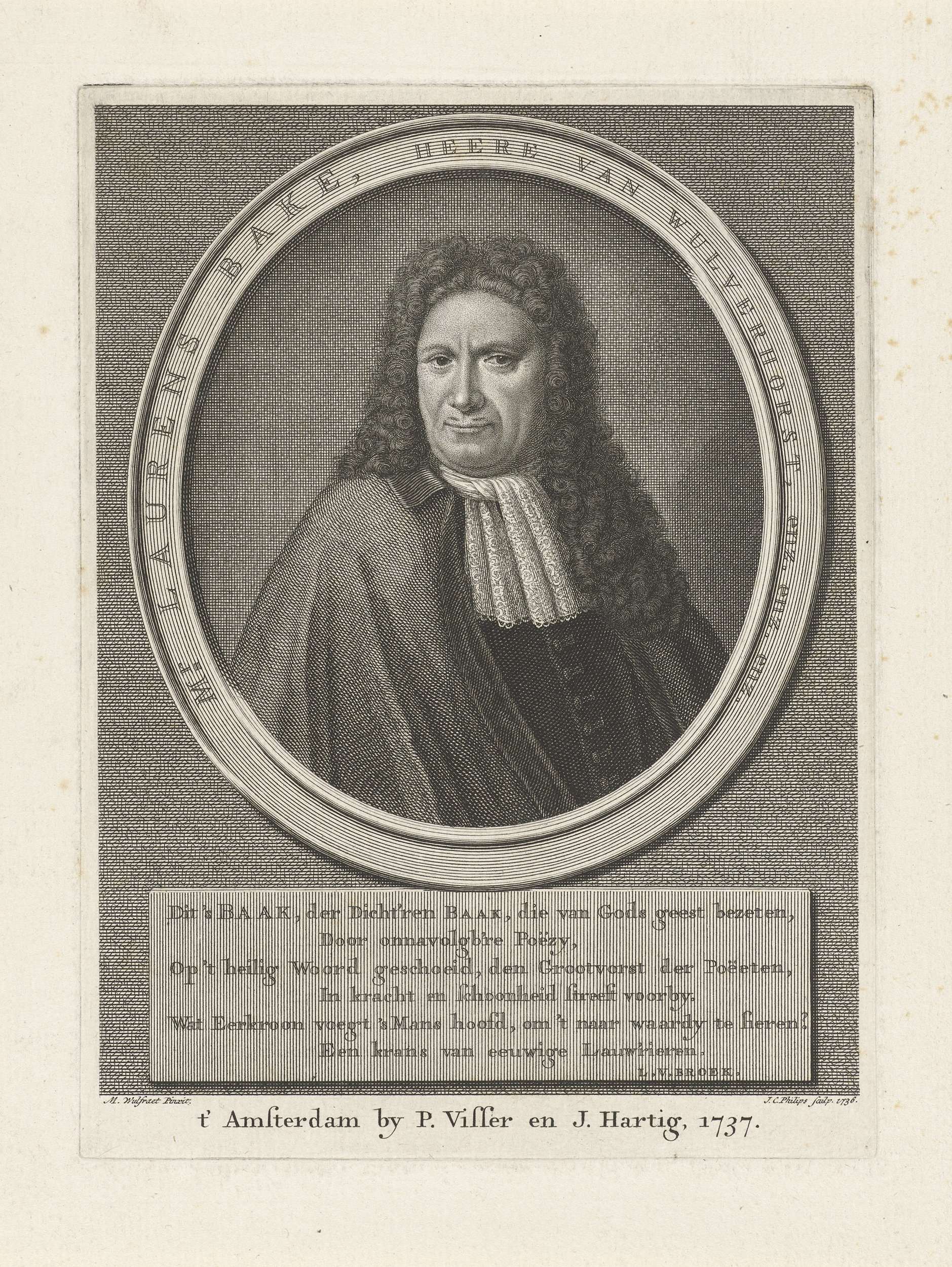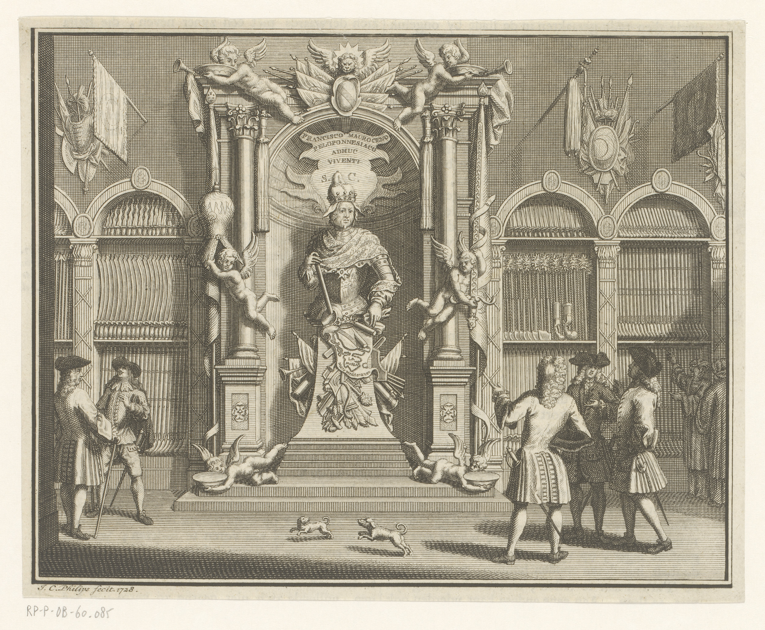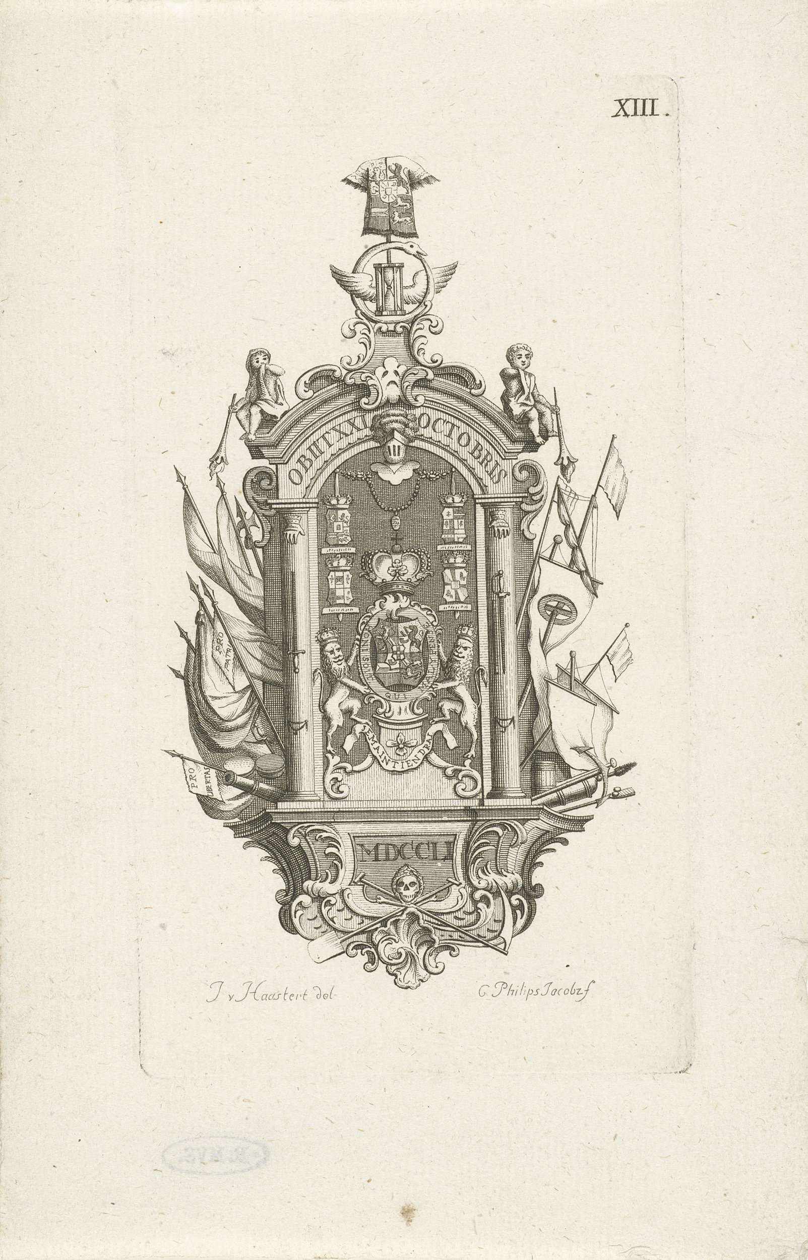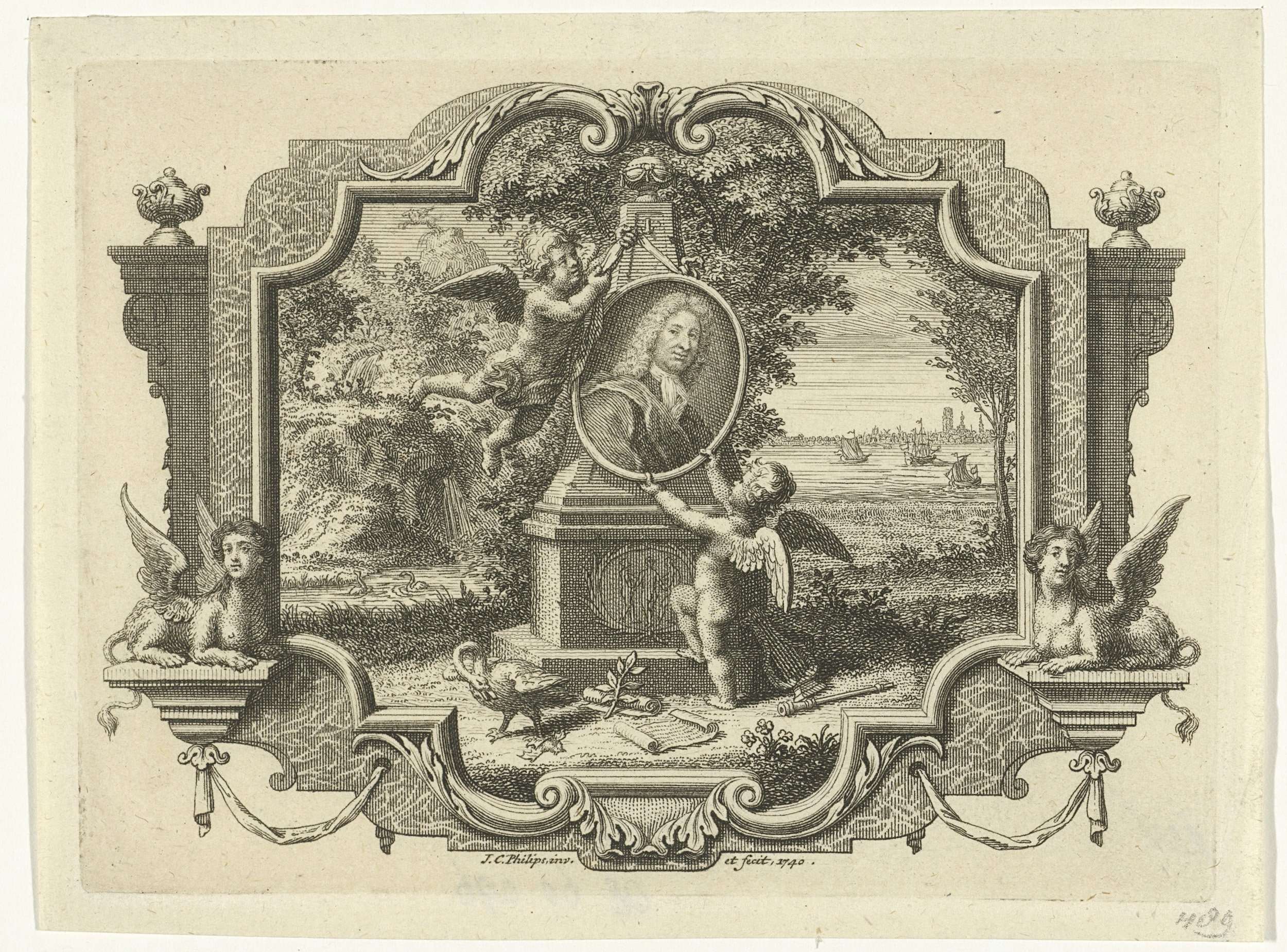 Twee putti bevestigen portret van Pieter Rabus aan g...