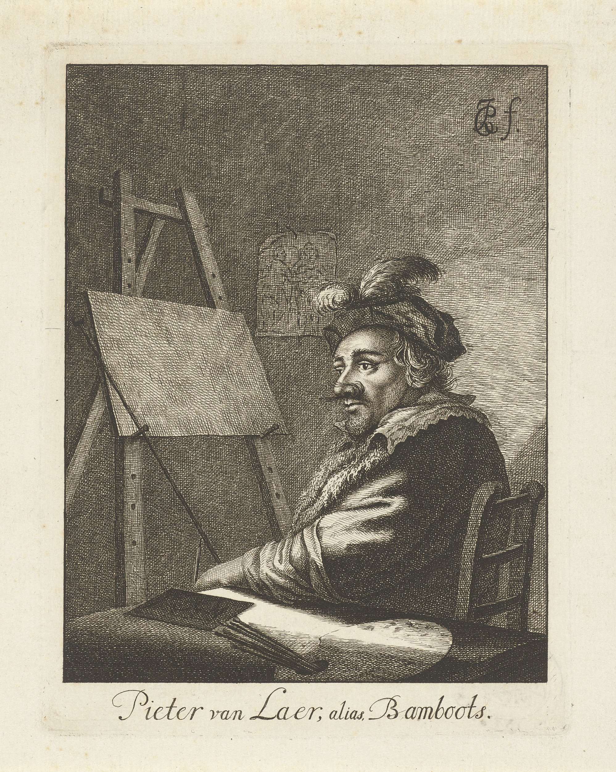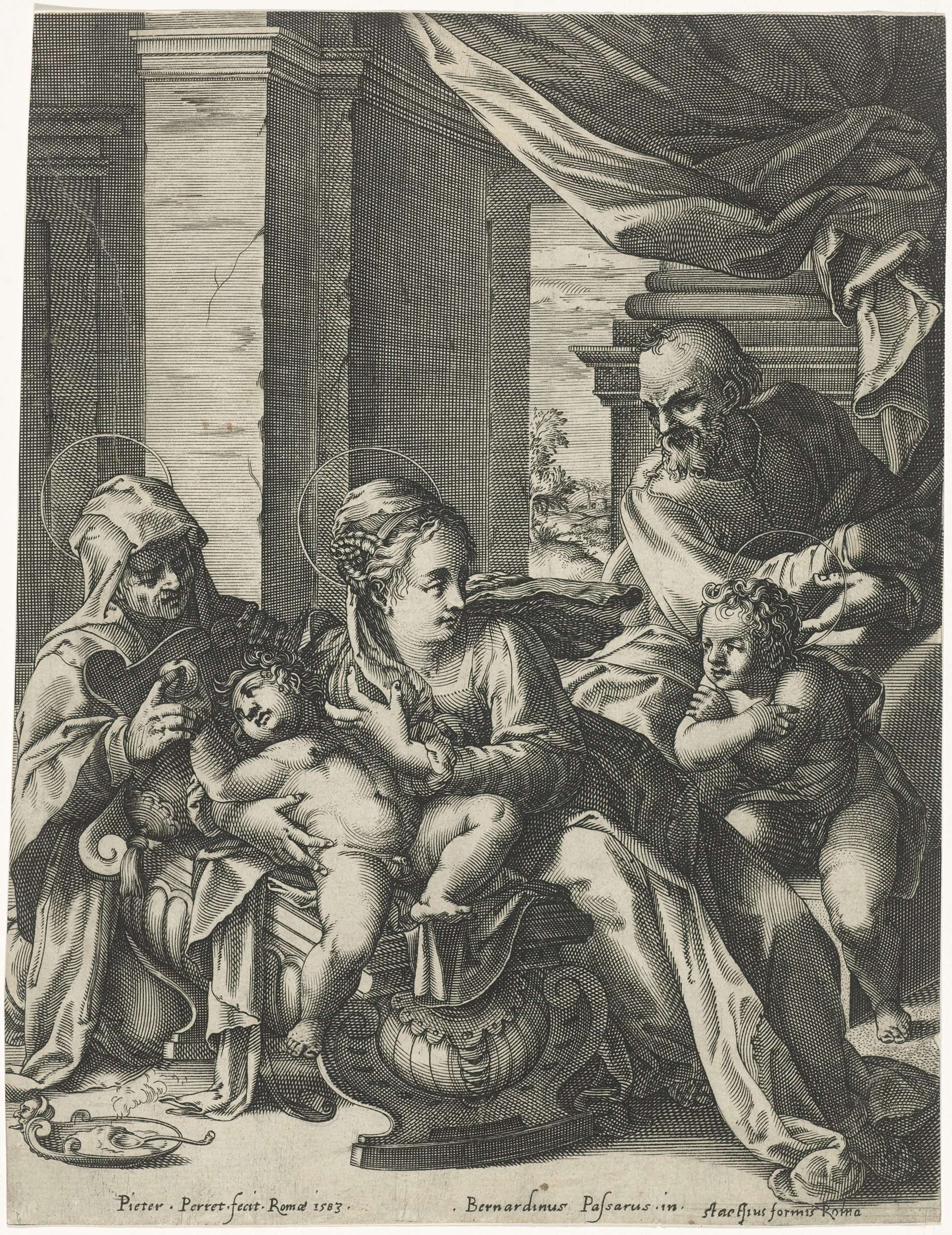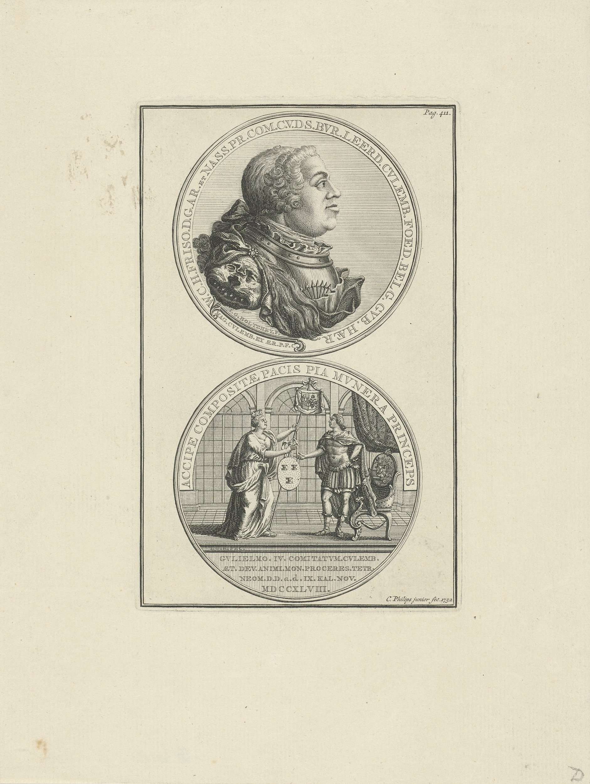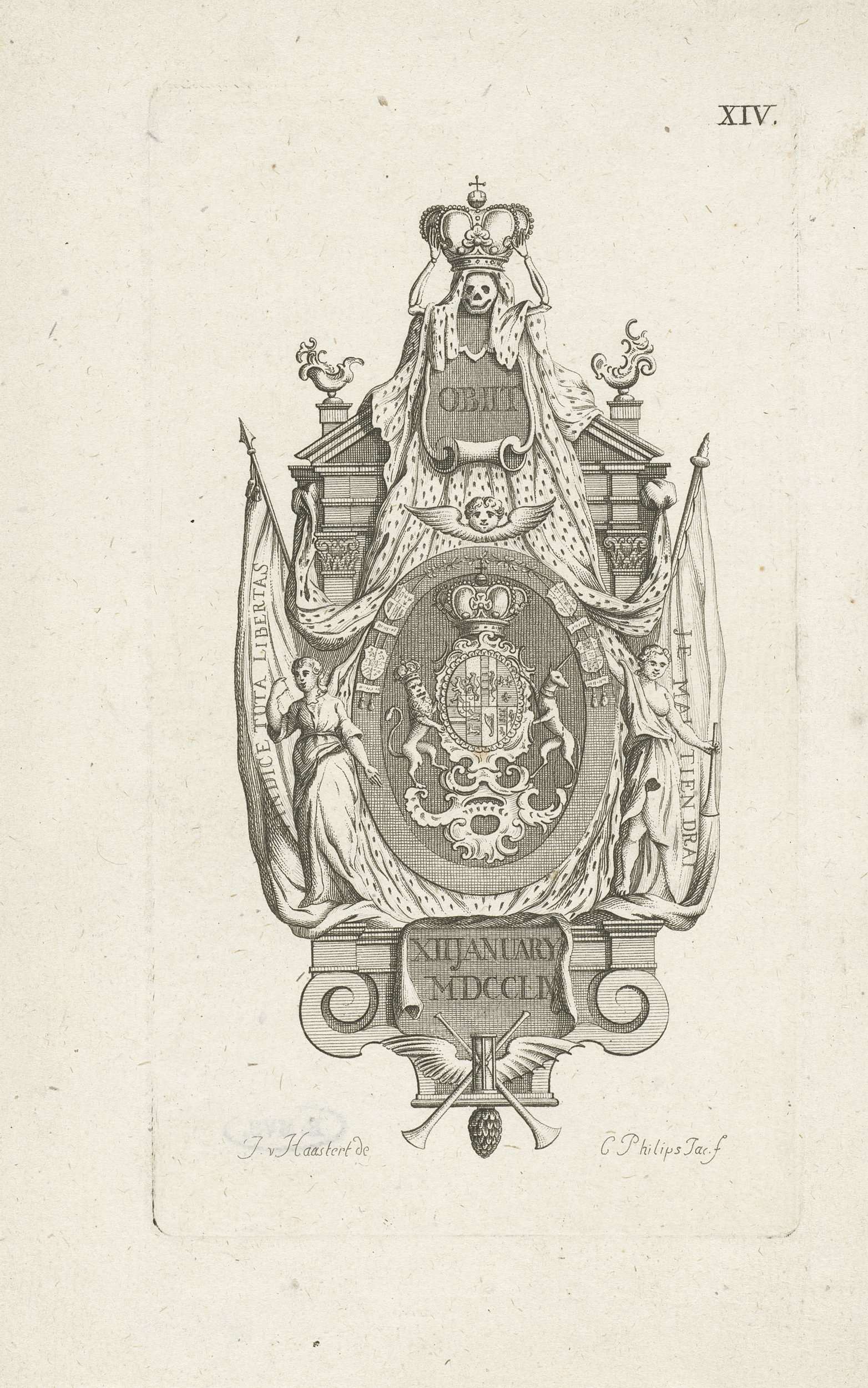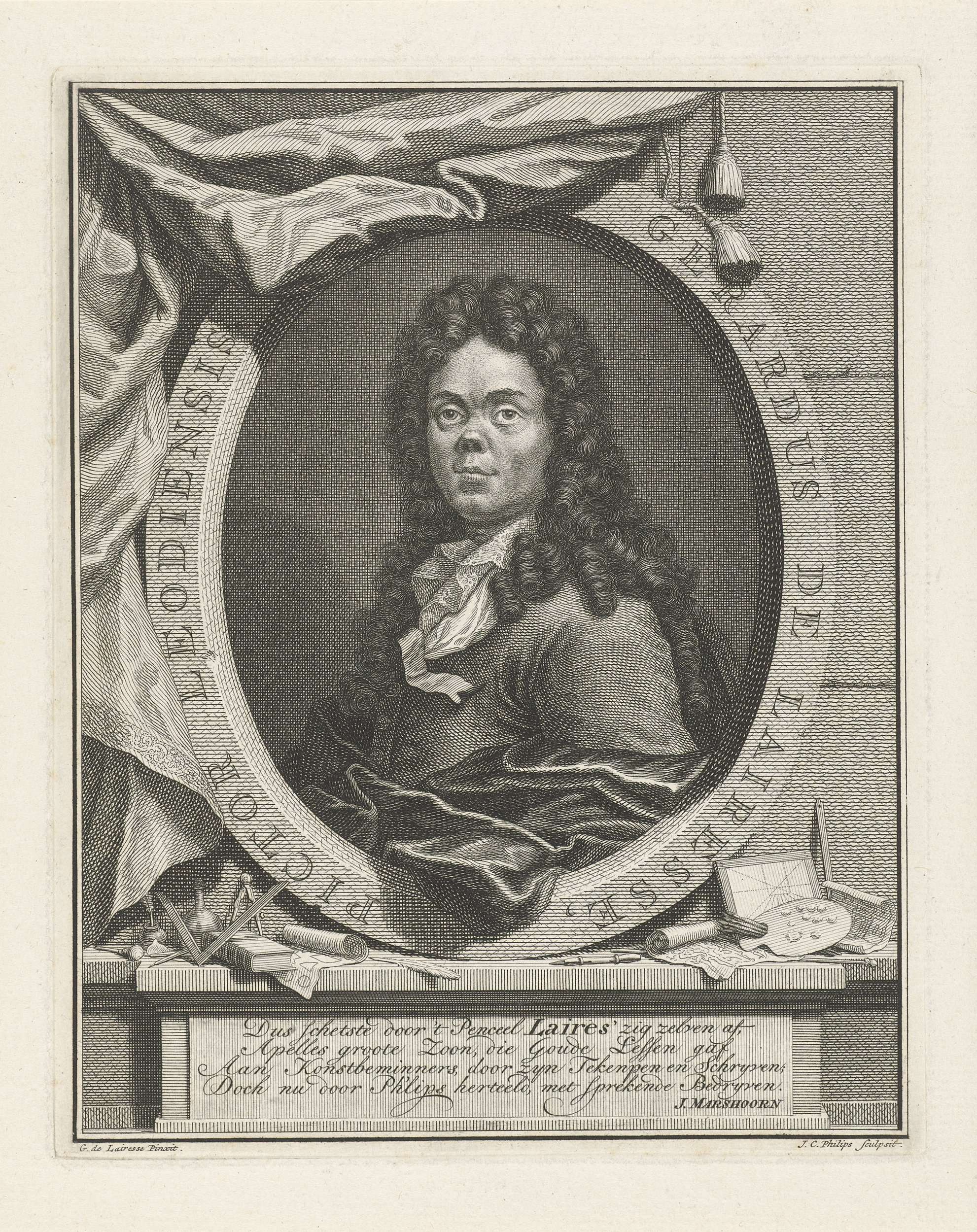Twee putti bevestigen portret van Pieter Rabus aan g...