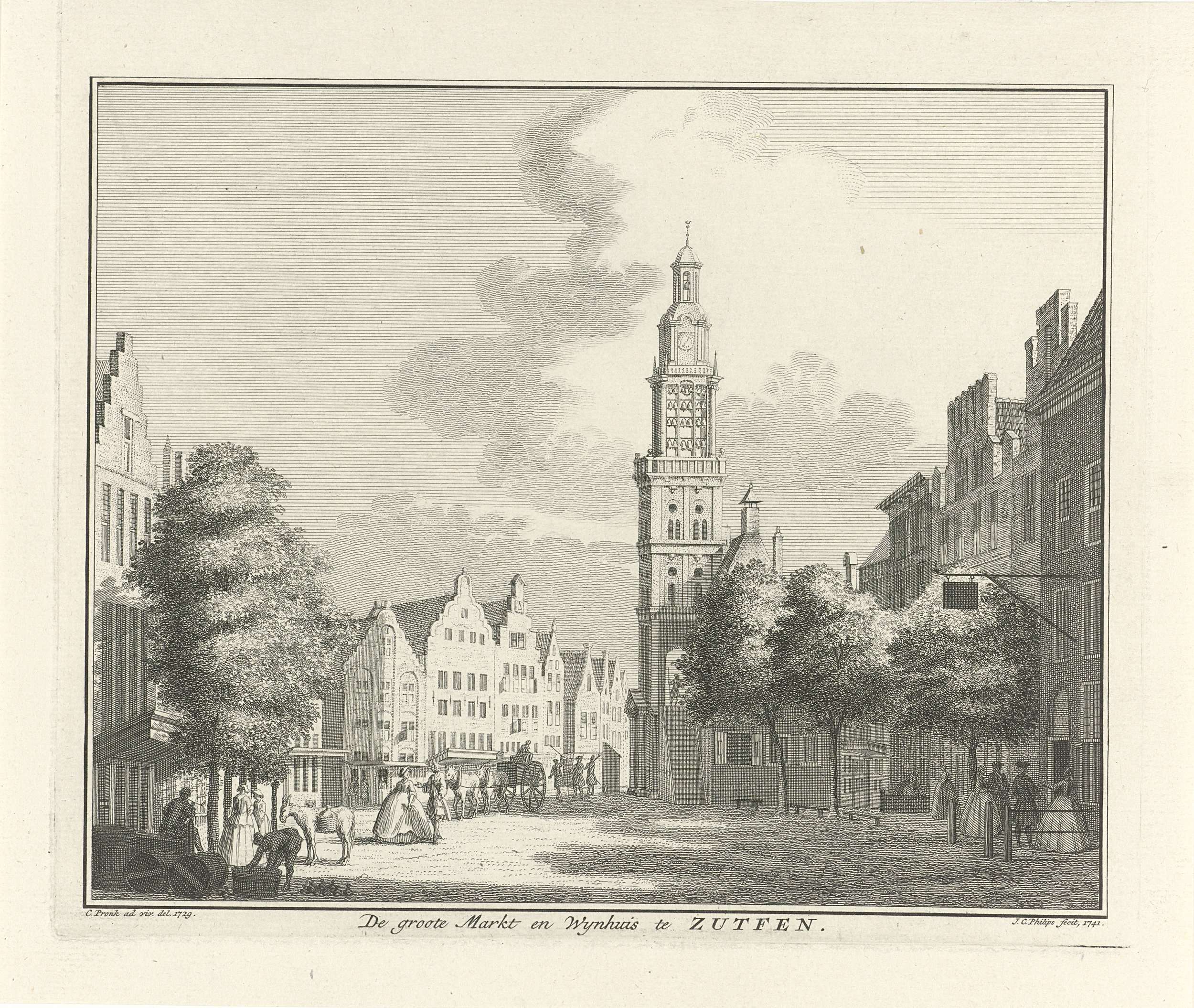 Gezicht op de Grote Markt en de Wijnhuistoren te Zut...