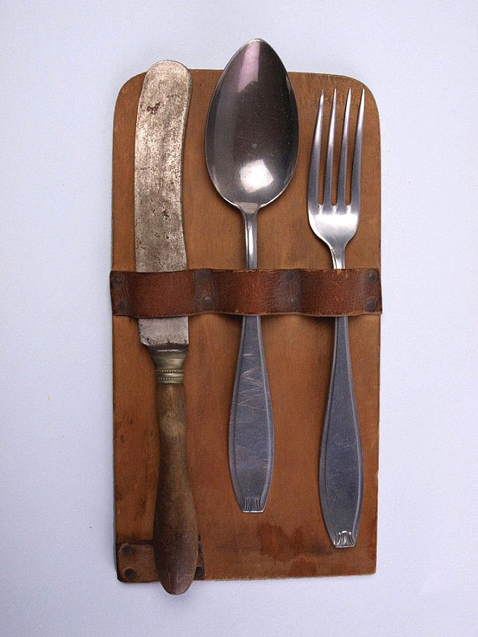 Bestek, set: mes, lepel, vork, op houten plankje