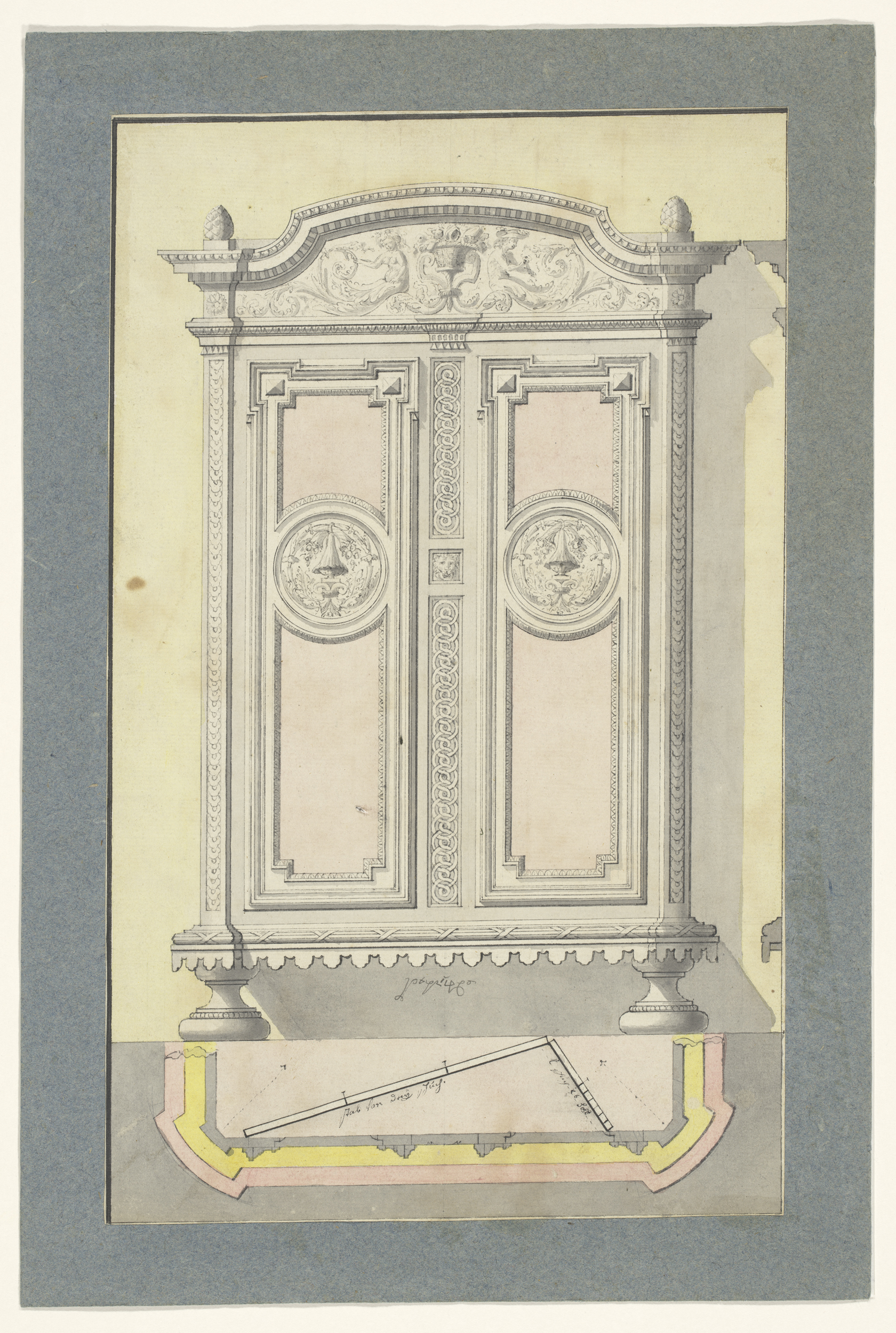 Ontwerp voor een open buffetkast, met eronder een pl...