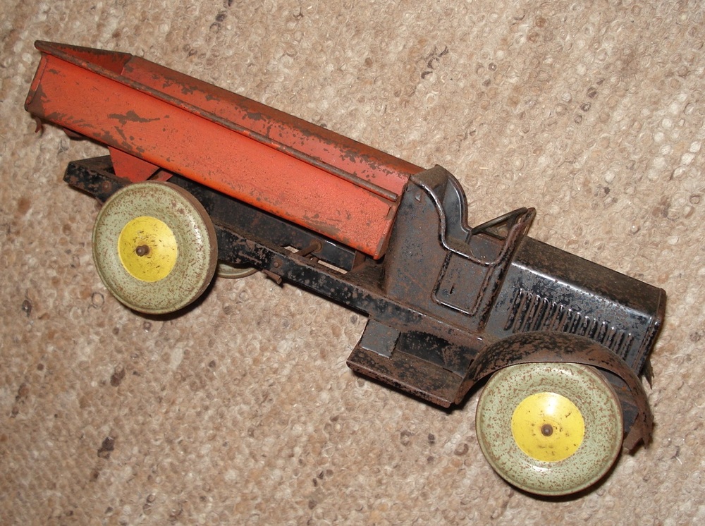 speelgoedvrachtauto. Rode laadbak en zwarte open zit...