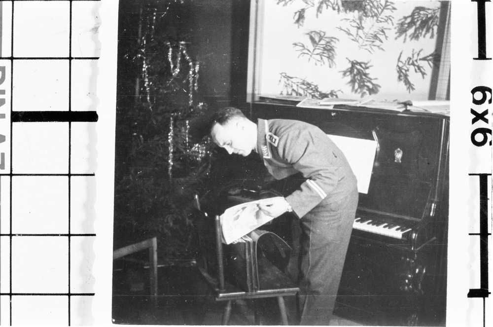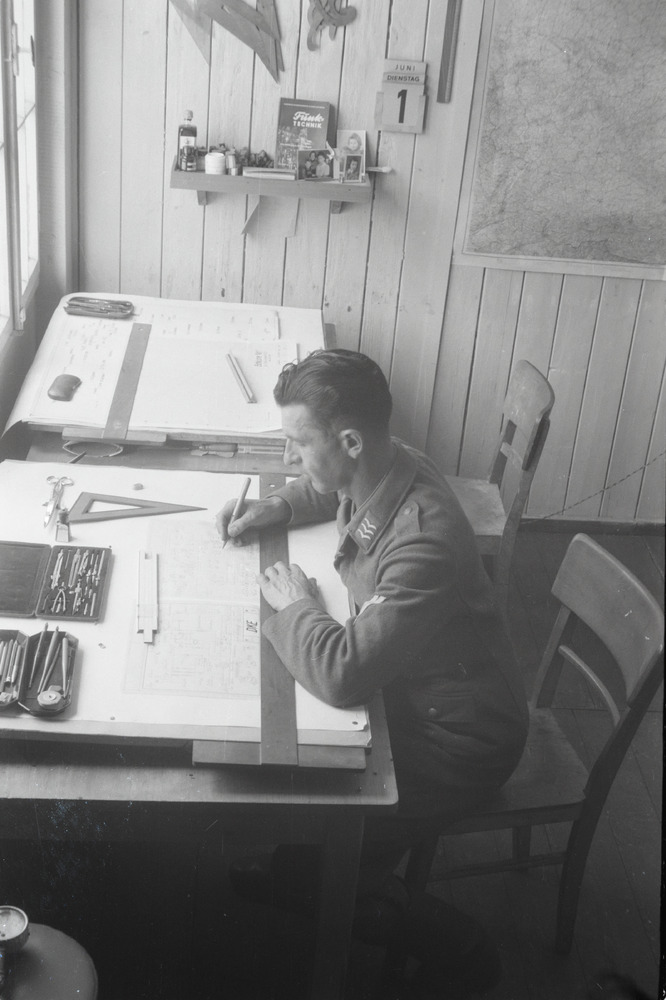 Een Luftwaffe Obergefreiter aan zijn tekentafel.