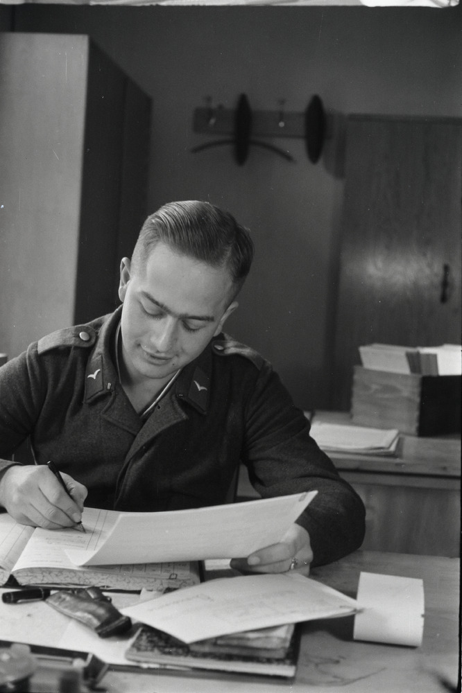 Een Luftwaffe Flieger werkt de boekhouding bij.