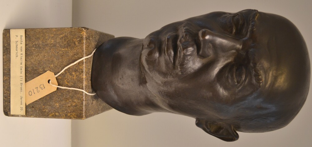 Portretkop van zwart gepatineerd brons op sokkel van...