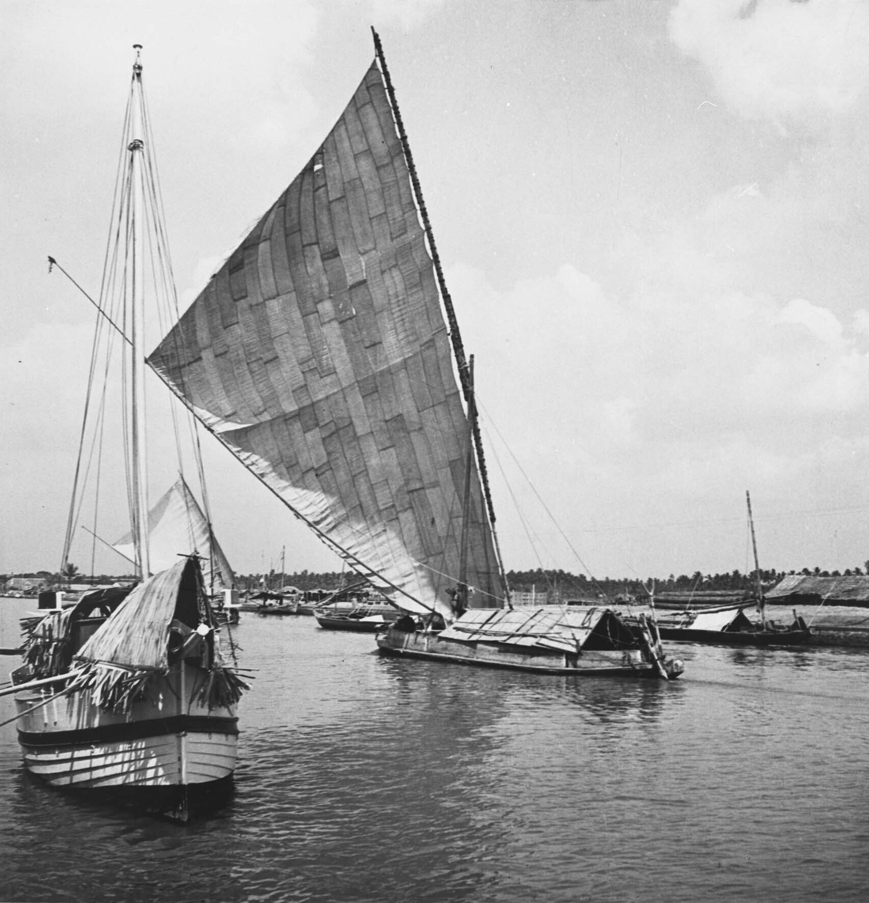 Een prauw met gehesen zeil, Pasar Ikan, Batavia