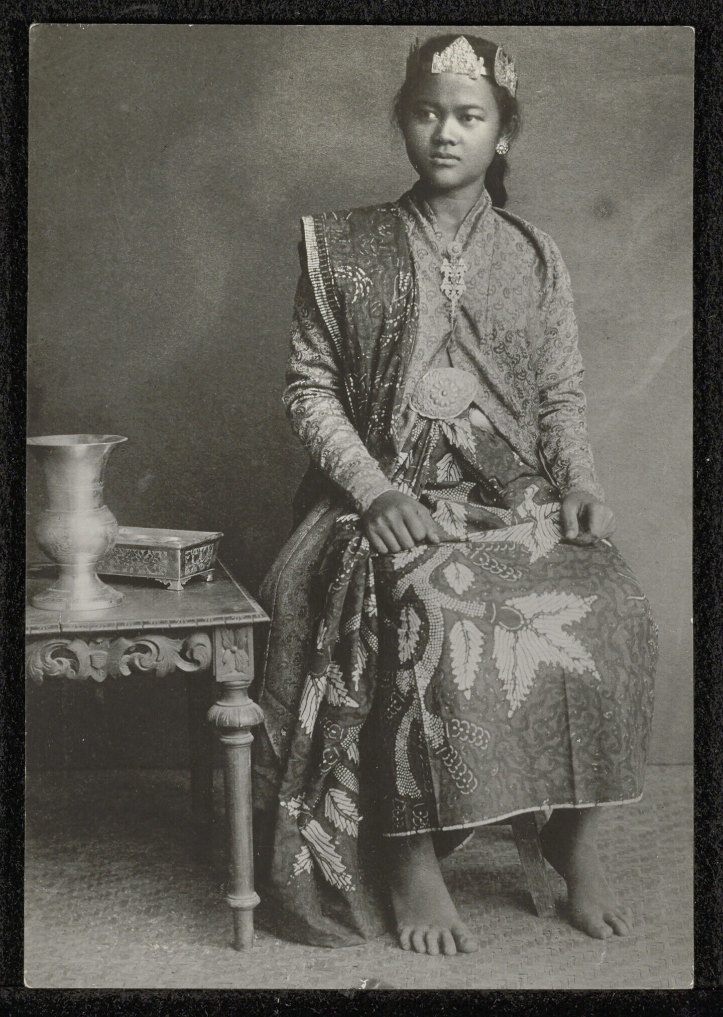 Studioportret ten voeten uit van Njai Raden Wiarsih,...