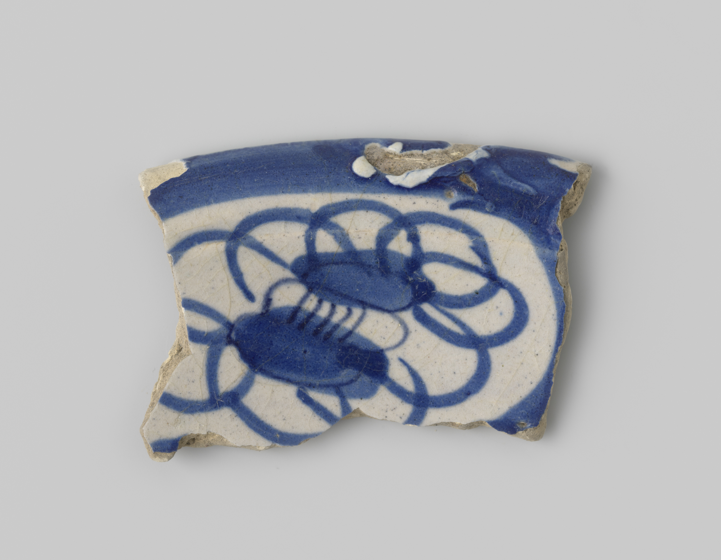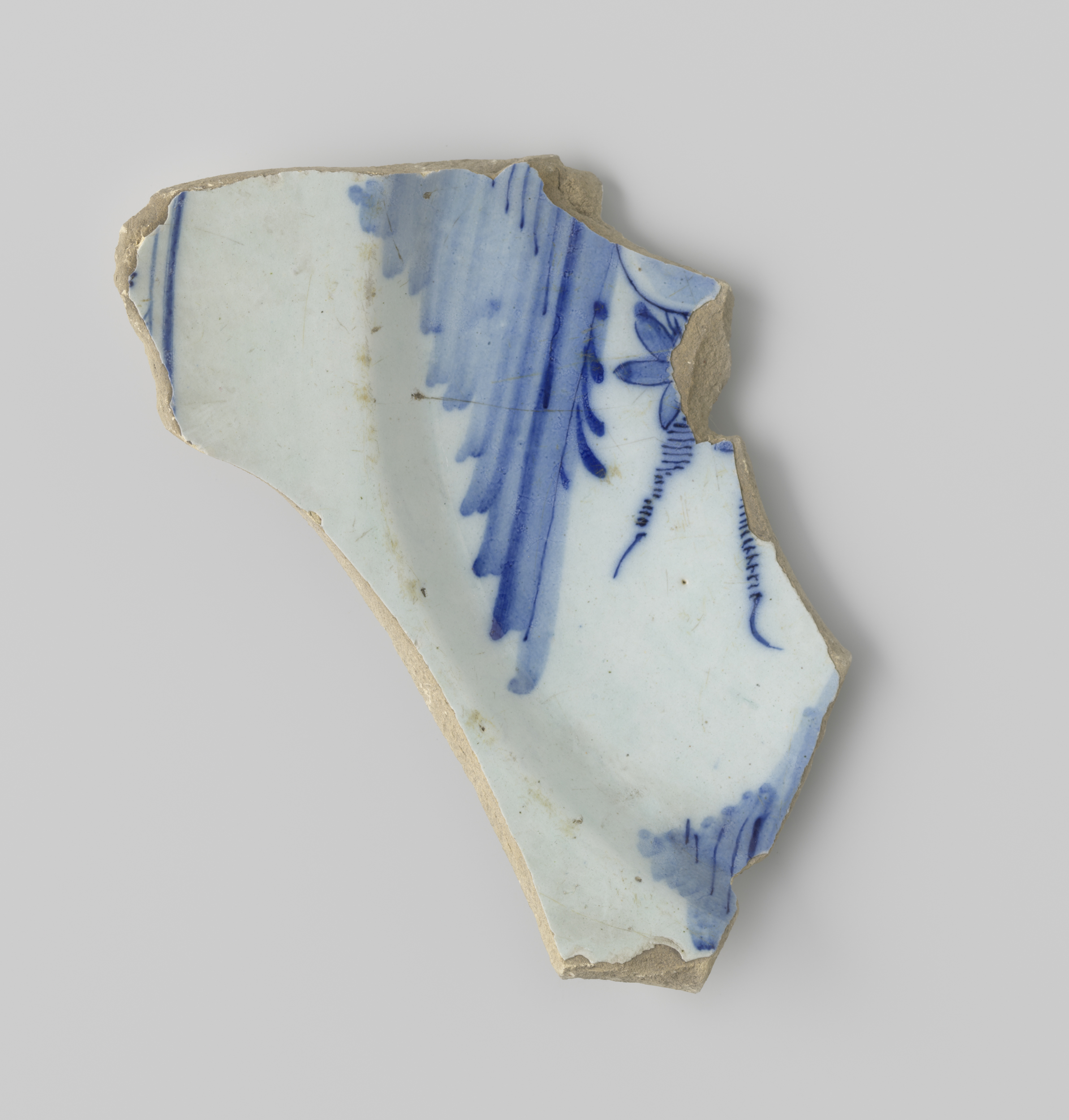 Scherf van witbakkend aardewerk, met aan de voorzijd...
