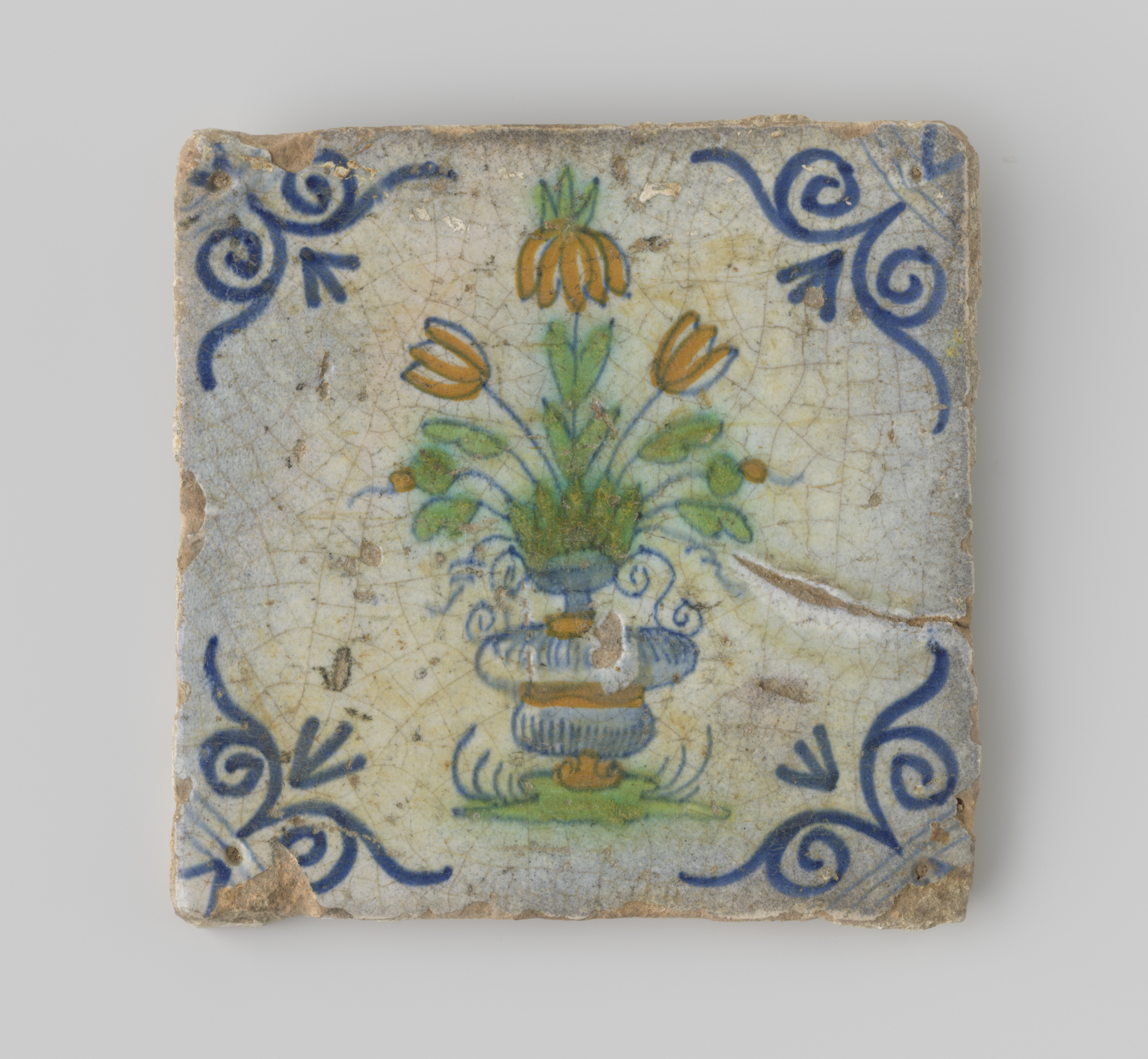 Tegel (beschadigd) voorzien van wit glazuur, waarop ...
